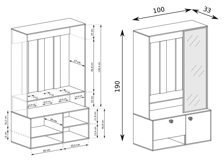 • Wymiary całkowite: wysokość: 190 cm, szerokość: 100 cm, głębokość: 33 cm.