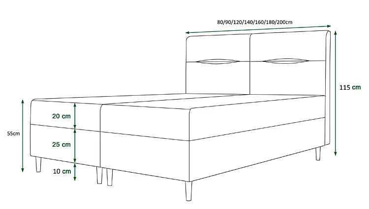 • Powierzchnia spania 80x200 cm, 90x200 cm, 120x200 cm, 140x200 cm, 160x200 cm, 180x200 cm, 200x200 cm.