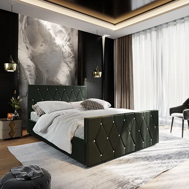 Łóżko Diamare marki Elior to prawdziwa ozdoba sypialni – mebel, który łączy w sobie elegancję, komfort i dbałość o każdy detal. Już na pierwszy rzut oka zachwyca wyjątkowym designem, w którym klasyczne formy łączą się z luksusowym wykończeniem. Charakterystyczne, głębokie pikowanie zdobi zarówno wezgłowie, jak i front łóżka, a kryształowe guziki dodają mu subtelnego blasku i wyrafinowanego stylu. Dzięki temu Diamare staje się nie tylko miejscem wypoczynku, ale także elementem dekoracyjnym, który nadaje sypialni charakteru rodem z najlepszych aranżacji wnętrzarskich. To idealny wybór dla osób, które marzą o sypialni pełnej klasy i elegancji, a jednocześnie cenią sobie wygodę oraz praktyczne rozwiązania w codziennym użytkowaniu.