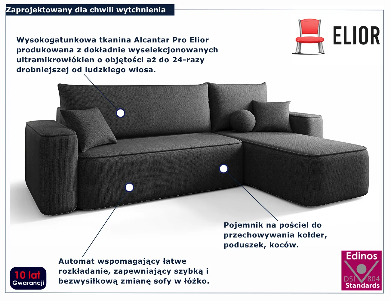 • Produkt posiada certyfikat jakości "Edinos Standards DSI 804", który potwierdza najwyższą jakość wykonania mebla oraz pełny stopień zgodności poszczególnych jednostek wytworzonego wyrobu z przyjętym wzorcem.