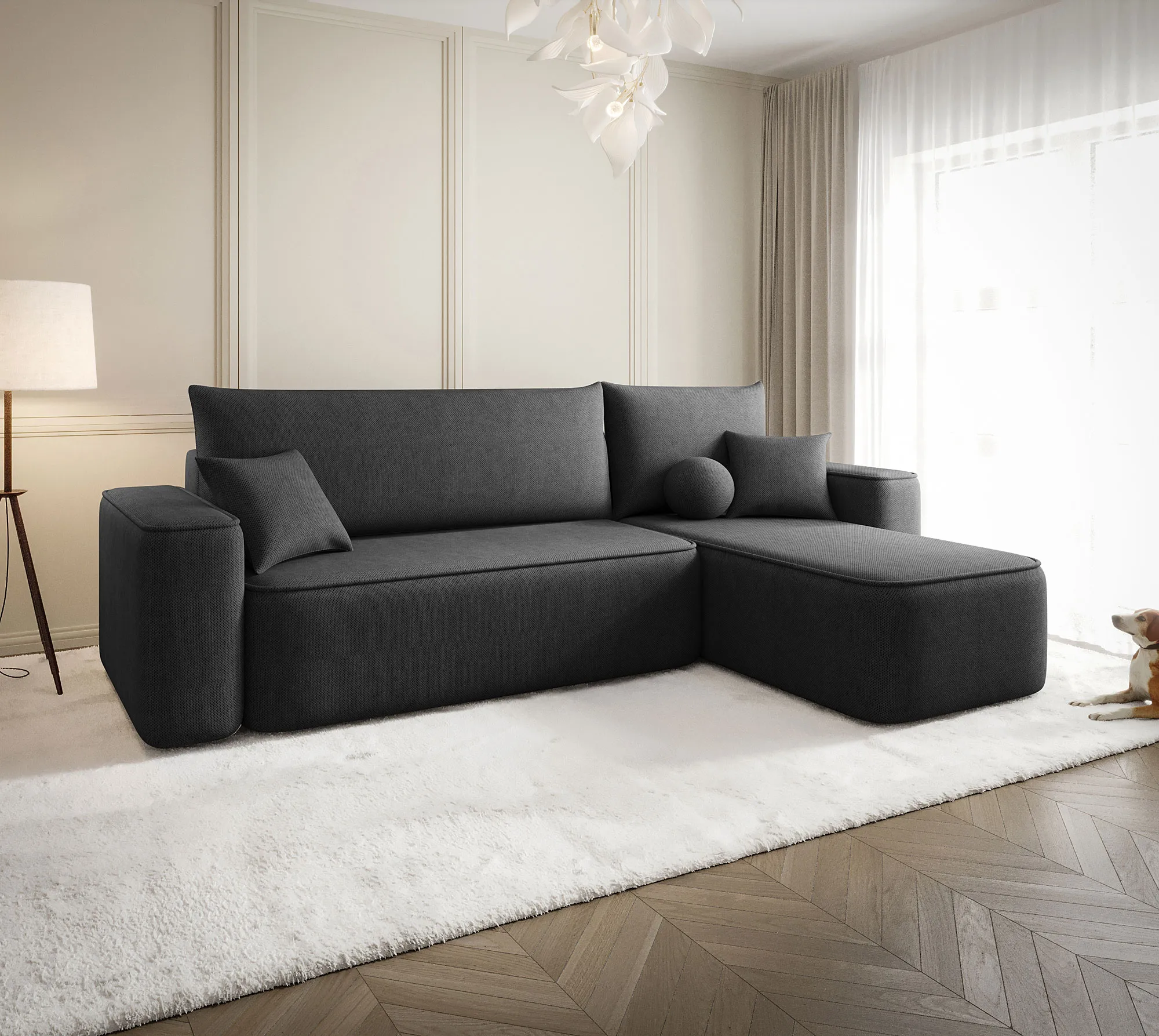 Aranżacja wnętrza z sofą w kolorze grafitowym Mossira 3X