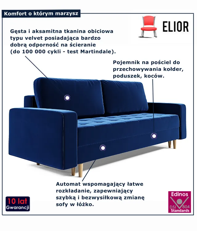 • Welurowa tapicerka - miękka, przyjemna w dotyku i elegancka.