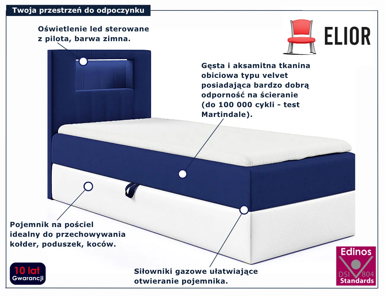 Łóżko pojedyncze Fenarro marki Edinos Premium to idealne połączenie funkcjonalności i estetyki. Zapewnia maksymalny komfort snu, a jednocześnie prezentuje się wyjątkowo stylowo. Wybierz Fenarro, jeśli szukasz mebla, który łączy w sobie wygodę, nowoczesny design i dopracowane detale.