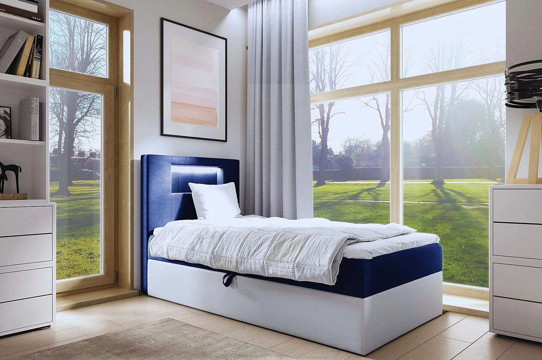 Aranżacja wnętrza z granatowym łóżkiem Fenarro