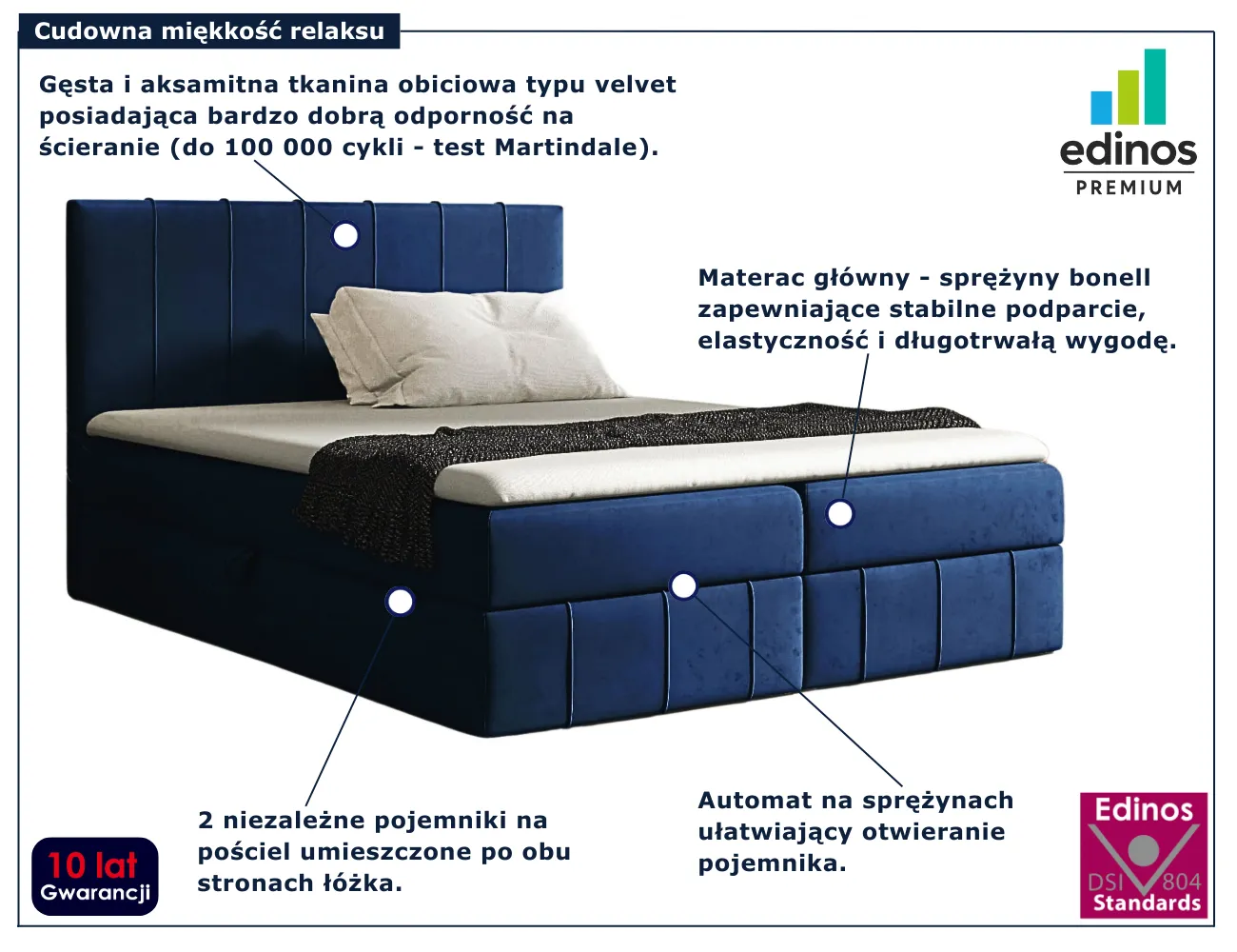 • Produkt posiada certyfikat jakości "Edinos Standards DSI 804", który potwierdza najwyższą jakość wykonania mebla oraz pełny stopień zgodności poszczególnych jednostek wytworzonego wyrobu z przyjętym wzorcem.