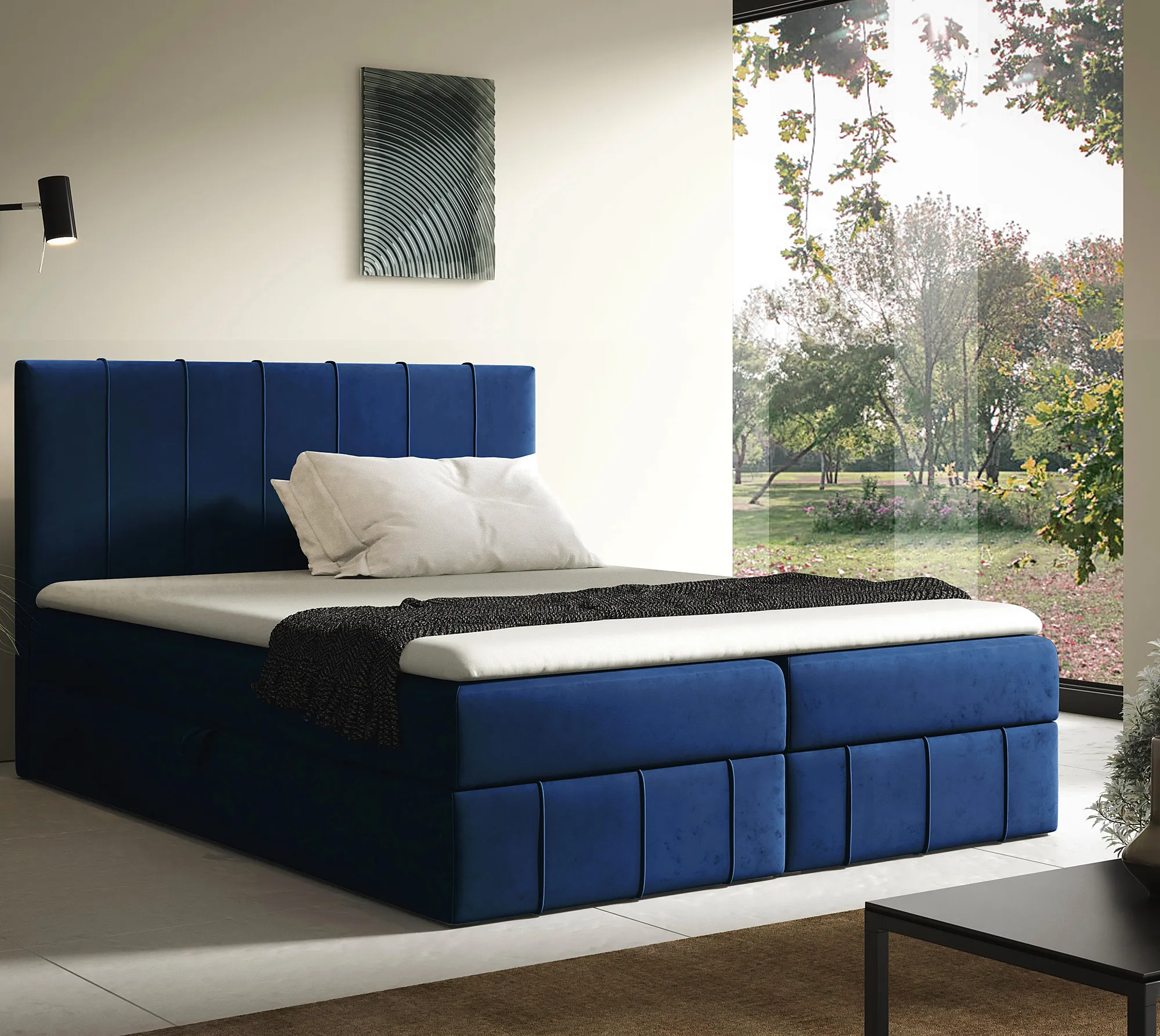 Aranżacja wnętrza z granatowym łóżkiem Elarivo