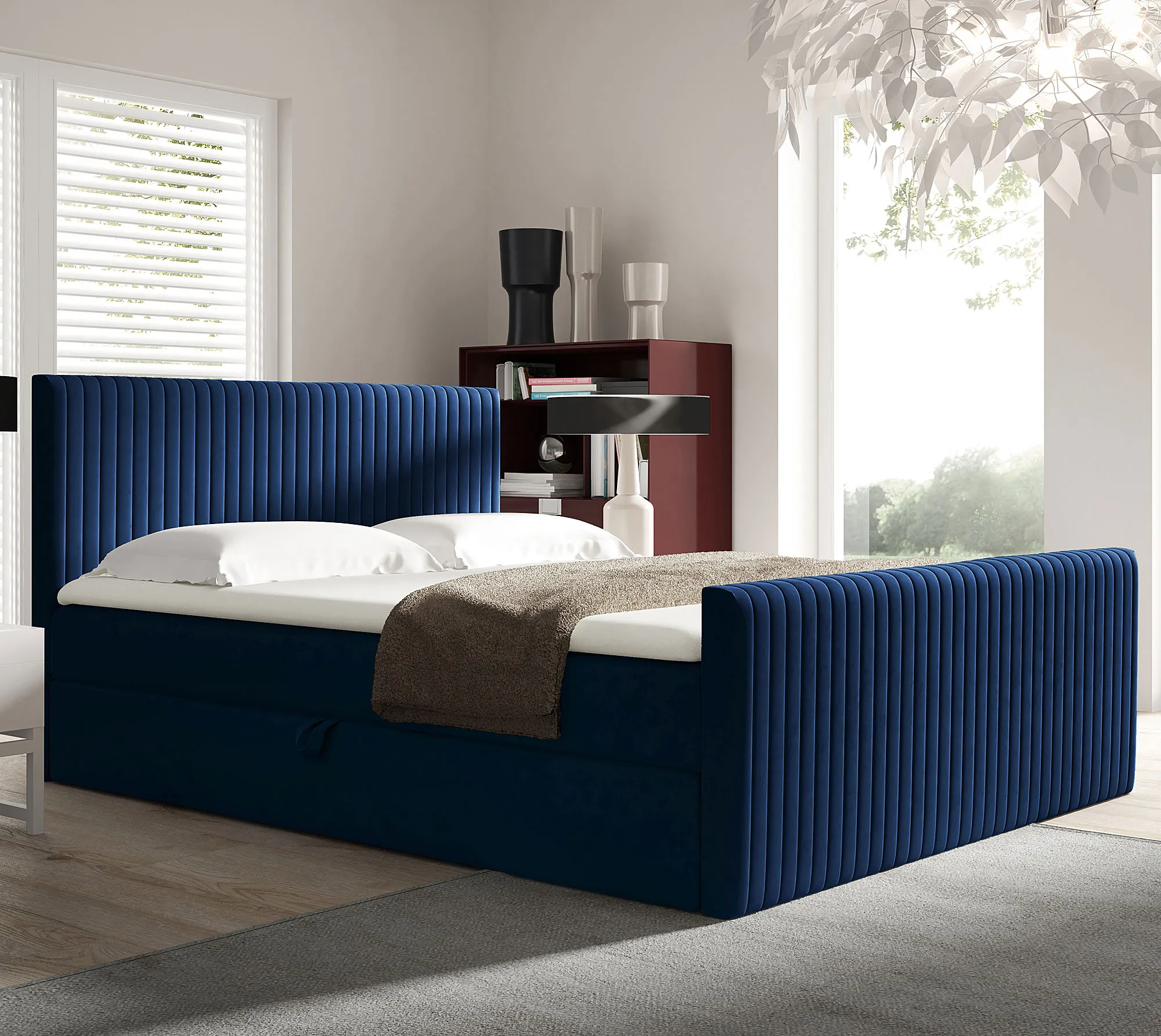 Aranżacja wnętrza z granatowym łóżkiem kontynentalnym Naverro