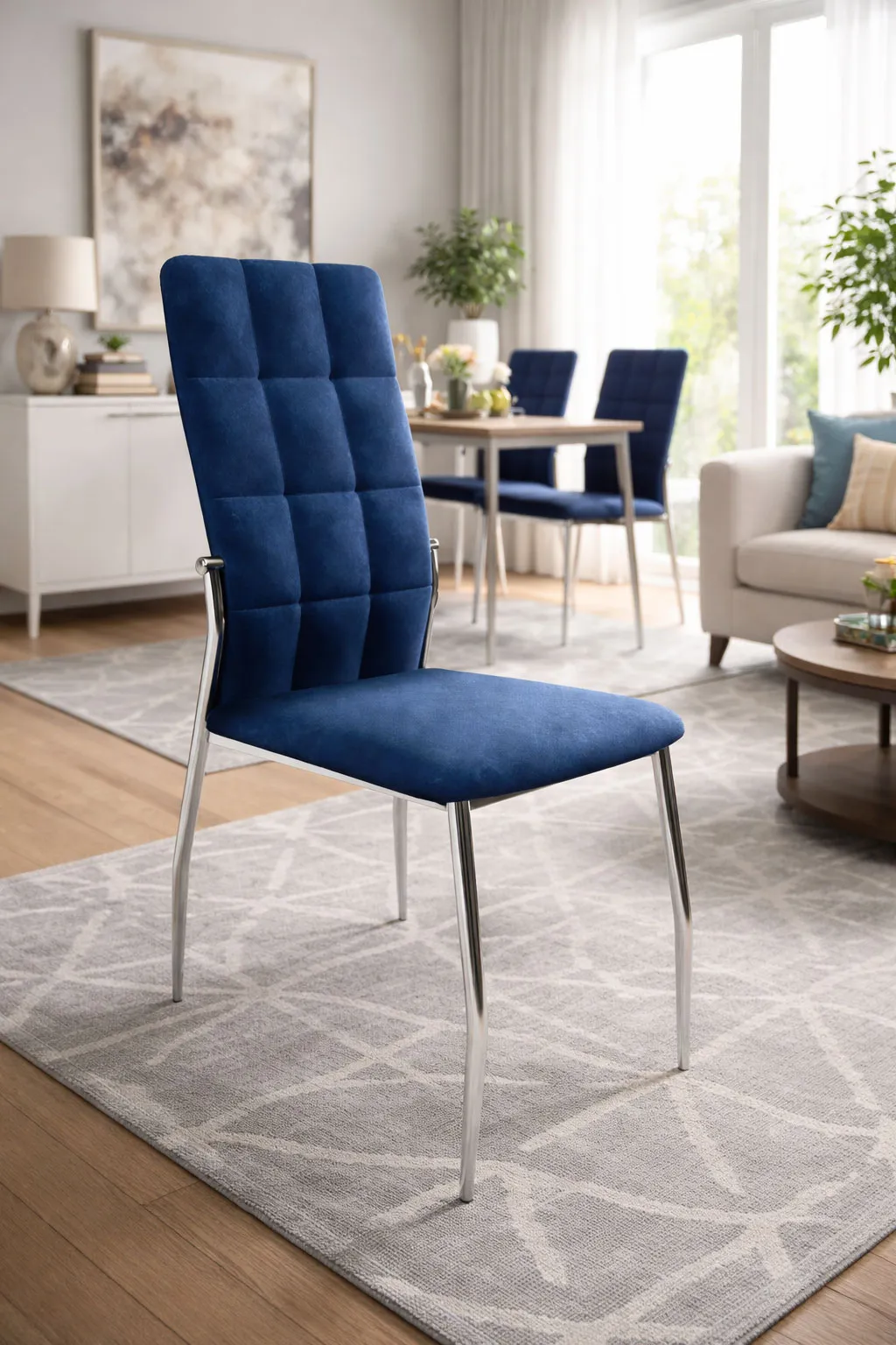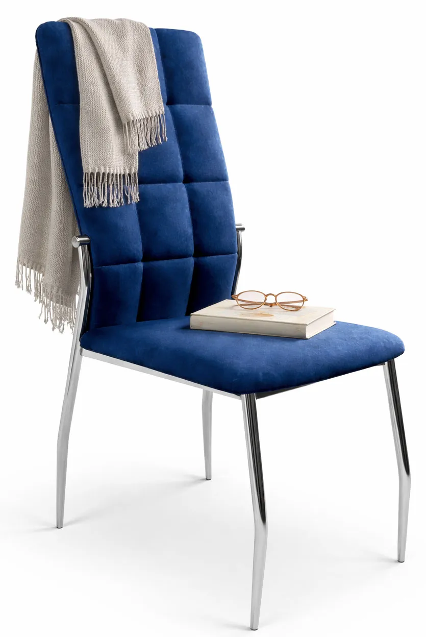 Aranżacja salonu z granatowymi krzesłami pikowanymi Ninila