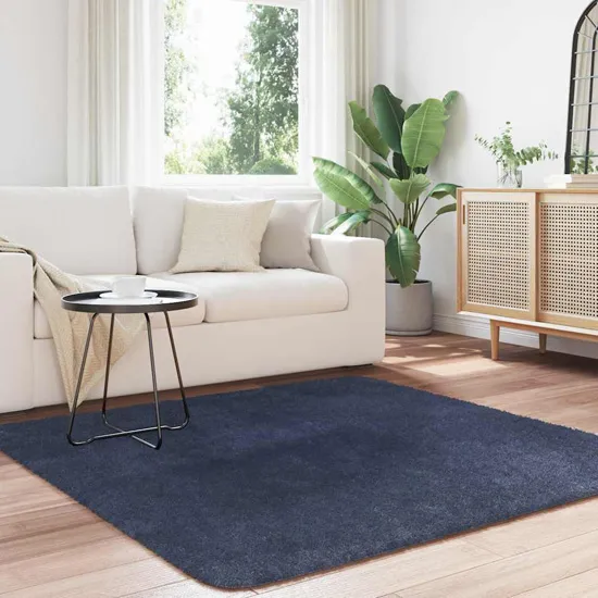 Dywan jest bardzo przyjemny pod stopami, a granatowy odcień świetnie komponuje się z jasnymi meblami. Miękkie włosie sprawia, że strefa salonu wygląda bardziej przytulnie, a całość świetnie dopełnia urządzone wnętrze.