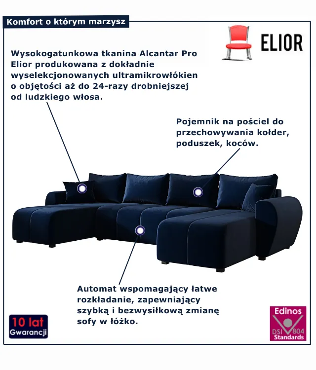 Wyobraź sobie salon, w którym każda chwila zamienia się w prawdziwy odpoczynek. Rano kawa z książką w ręku, popołudniu wspólna zabawa z dziećmi, a wieczorem seans filmowy z przyjaciółmi – wszystko w jednym miejscu, na jednym meblu. Narożnik rozkładany Aurelix 4X marki Edinos Premium to nie tylko część wystroju wnętrza, ale serce domowego życia. Jego imponujący kształt litery U otacza Cię miękkością, tworząc przestrzeń, w której każdy znajdzie swój własny kąt. To mebel, który łączy design, komfort i praktyczność, zmieniając codzienność w przyjemny rytuał.
