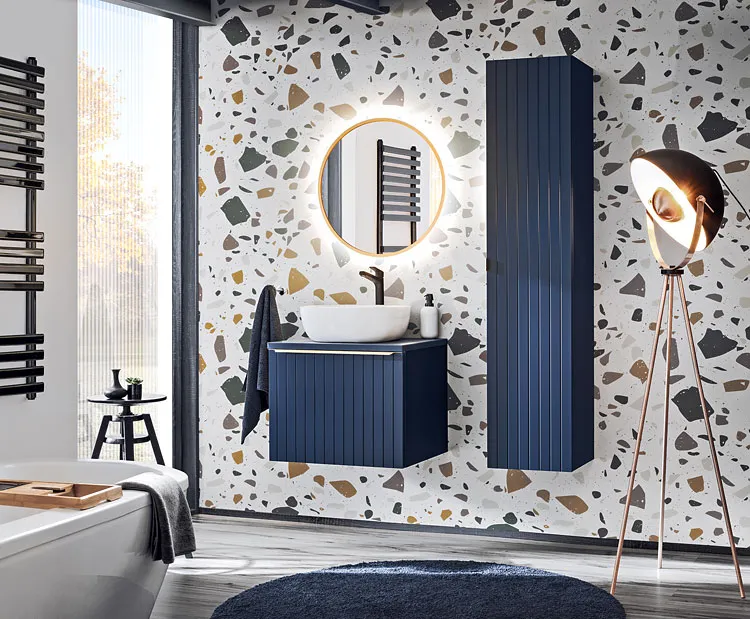 Kolekcja mebli łazienkowych Satino to projekt wykonany z myślą o miłośnikach stylu glamour. Ekskluzywny charakter mebli powstał z połączenia wyjątkowej kolorystyki, intrygujących frezów wykonanych na frontach mebli oraz złotych uchwytów nadających całości elegancji i szyku. Głęboki granat połączony z intrygującą szarością jest doskonałym kontrastem wprowadzającym szczyptę tajemniczości do jasnych wnętrz. Podwieszana forma mebli wprowadza do urządzanej aranżacji lekkość wizualną i ułatwia utrzymanie czystości. Szeroka gama dostępnych elementów kolekcji pozwoli Ci stworzyć aranżację perfekcyjnie dopasowaną do Twoich potrzeb. Niebanalny styl mebli Satino sprawi, że Twoja łazienka zaskakiwać będzie niepowtarzalnym wdziękiem.