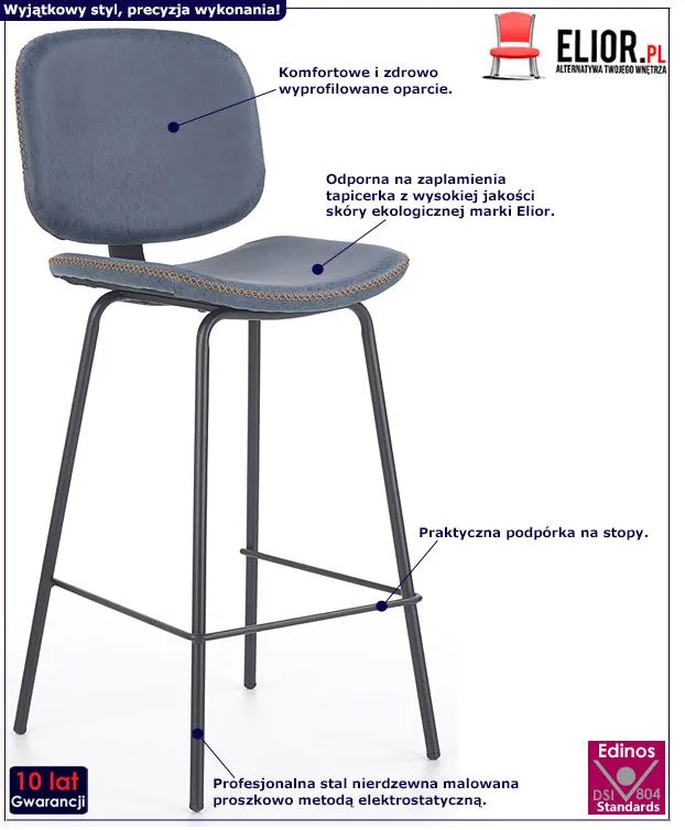 Wysokie krzesło Zanno wyróżnia się nie tylko swoją unikalną formą, ale także zastosowaniem materiałów najlepszej jakości. Designerska tapicerka mebla w kolorze ciemnoniebieskim pokryta została najwyższej jakości ekoskórą (skórą ekologiczną), łatwą do utrzymania w czystości (co jest szczególnie istotne w przypadku produktów wykorzystywanych podczas spożywania posiłków). Ekoskóra używana przy produkcji mebli marki Elior jest o wiele bardziej odporna na słońce oraz substancje płynne , co pozwala Ci na długie i bezpieczne użytkowanie. Już nie musisz się martwić, że rozlana kawa spowoduje konieczność wymiany mebla. Skóra ekologiczna została pokryta warstwą polichlorku winylu. Czarny profil krzesła stworzony został z nierdzewnej stali malowanej odpornym na zarysowania i zadrapania. Najwyższa jakość techniki polimeryzacji pozwoliła zaoferować firmie Elior aż 10 lat gwarancji na swoje produkty. Już nie musisz się martwić, że po kilku latach część farby odpryśnie od mebla . Modna kolorystyka i prosta forma sprawiają, że krzesło doskonale odnajduje się we wnętrzach urządzonych w stylu industrialnym (loftowym), jak też minimalistycznym czy nowoczesnym. Zanno nadaje wnętrzu niecodziennego charakteru i modnego "przemysłowego" designu, a każde rodzinne spotkanie zamienia w niezwykłą ucztę. Nadaj Twojemu wnętrzu wyrazistego designu w ekspresyjnym, industrialnym stylu z hokerem Zanno!