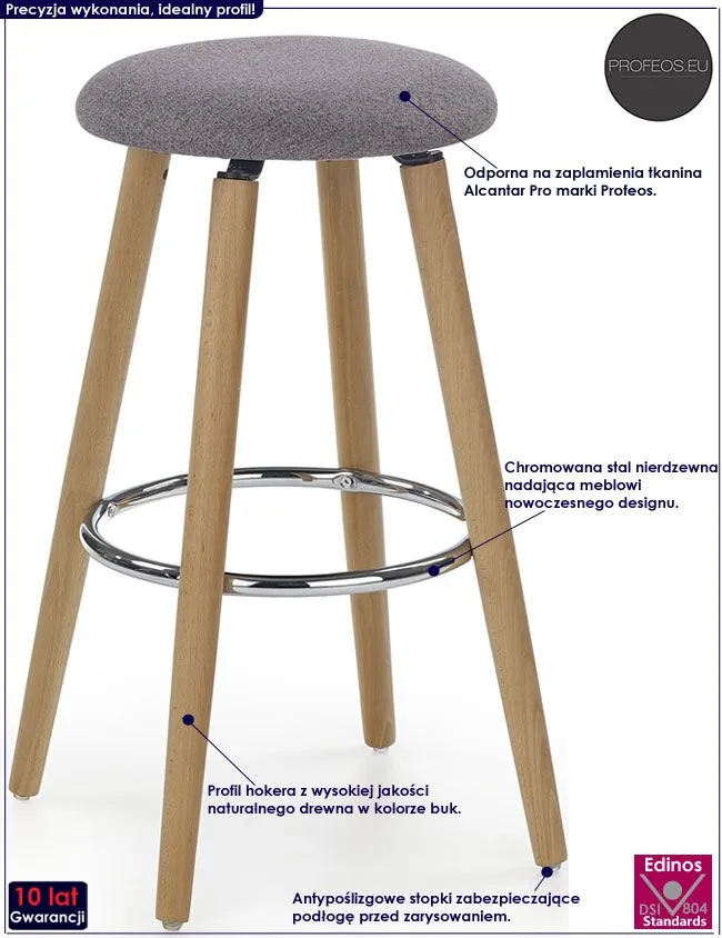 Komfortowy taboret Alaia wyróżnia się nie tylko swoją unikalną formą, ale także zastosowaniem materiałów najlepszej jakości. Designerska tapicerka mebla wykonana została z wysokiej jakości tkaniny Alcantar Pro, charakteryzującej się dużą odpornością na ścieranie i zabrudzenie oraz niezwykłą miękkością w dotyku (dzięki warstwie poliuretanu). Tkanina Alcantar Pro marki Profeos, która jako jedyna na rynku produkowana jest z dokładnie wyselekcjonowanych ultramikrowłókien o objętości aż do 24-razy drobniejszej od ludzkiego włosa, charakteryzuje się wyjątkową żywotnością, odpornością oraz niezwykłą łatwością w utrzymaniu. Posiada ponadprzeciętne cechy wytrzymałościowe, dzięki czemu unikniesz co sezonowej wymiany tapicerki. Tkanina Alcantar jest także bardzo praktyczna i można ją czyścić na mokro, co jest niezwykle istotne w przypadku mebli wykorzystywanych podczas posiłków. Profil hokera w kolorze buk stworzony jest z naturalnego drewna wolnego od alergenów, a następnie zabezpieczonego hipoalergiczną emulsją wodną. Komfortową podpórkę na stopy wyprodukowano z najwyższej jakości chromowanej stali o zawartości aż stali nierdzewnej oraz chromu, co gwarantuje mu niezwykły efekt wizualny, posiadając przy tym ponadprzeciętne cechy antykorozyjne oraz lepszą odporność na uszkodzenia mechaniczne . Stonowana kolorystyka sprawia że hoker świetnie odnajduje się we wnętrzach urządzonych zarówno w stylu nowoczesnym, jak też minimalistycznym czy skandynawskim. Okrągły stołek Alaia doskonale sprawdza się zarówno w pomieszczeniach mieszkalnych, jak i komercyjnych. Pozwól mu odmienić także Twoje wnętrze!