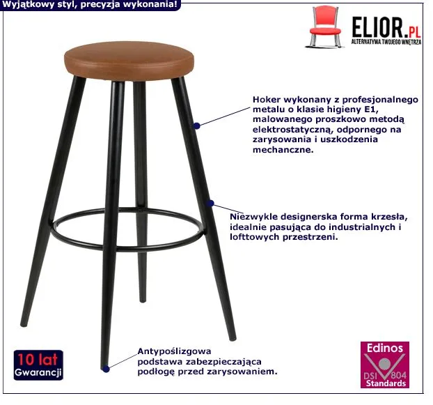 Wyjątkowo, starannie zaprojektowany hoker Marajo jest meblem cechującym się ciekawą, urzekającą formą. Jest to zasługa między innymi starannie dobranych i niezwykle trwałych materiałów meblarskich. Dzięki nim taboret użytkuje się naprawdę wygodnie, przyjemnie i co istotne – bez uszkodzeń przez wiele lat. Do produkcji hokera wykorzystano poddane specjalistycznej obróbce, nowoczesne surowce. Siedzisko mebla to profesjonalna i wysokogatunkowa skóra ekologiczna, odporna na zaplamienia i ścieranie się. Odznacza się ona wyjątkową miękkością. Podstawa hokera to profesjonalny metal malowany proszkowo metodą elektrostatyczną o klasie higieny E1, odporny na zarysowania i uszkodzenia mechaniczne. Jakże to istotne, by meble, w które inwestujemy cechowało staranne, porządne wykonanie. Na szczęście z vintage hokerem Marajo nie trzeba się o to martwić! Ten pełen modernistycznego, a przy tym interesującego charakteru mebel wciąż cieszy oko niebywałym wdziękiem. Marajo posiada bezsprzecznie wiele zalet – trwałość, stabilność, dokładne wykonanie, funkcjonalizm i oczywiście świeżą, pełną klasy i pomysłowości prezencję. Chyba każdy przyzna, że warto mieć tak ekstrawagancki i funkcjonalny mebel w swoich starannie i przemyślanie zaaranżowanych i wypielęgnowanych stylowo przestrzeniach. Zaaranżuj w swoim wnętrzu wyjątkowy klimat z nowoczesną harmonią! Połączenie wygody i świetnego stylu jest możliwe - udowadnia to rewelacyjna propozycja meblarska od marki Elior, jaką jest nowoczesny hoker Marajo.