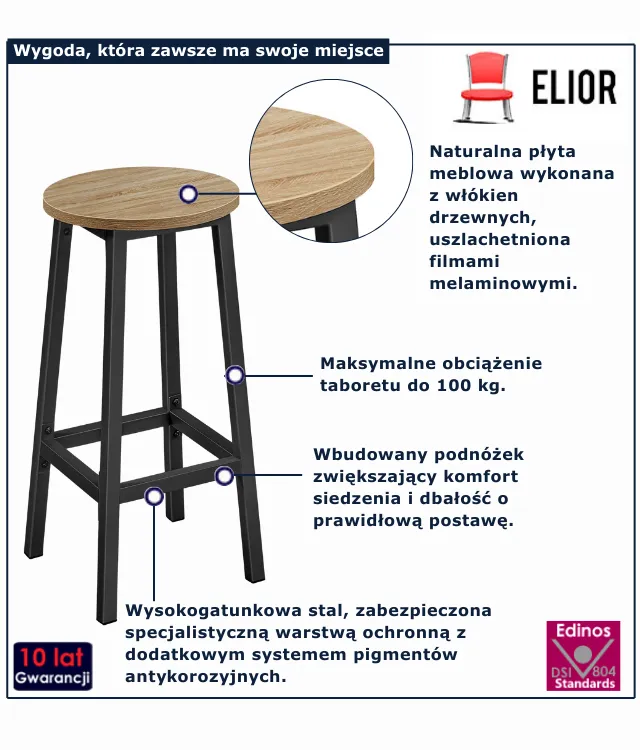 • Wysokie siedzisko – idealne do kuchennej wyspy czy wysokiego stołu.