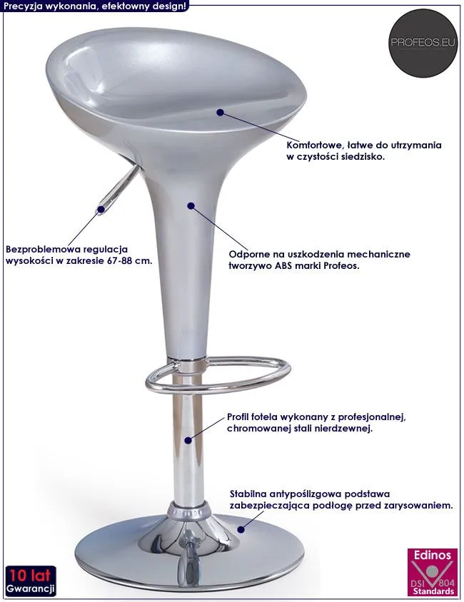 Komfortowy hoker Haru wyróżnia się nie tylko swoją unikalną formą, ale także zastosowaniem materiałów najlepszej jakości. Lakierowane siedzisko mebla wykonane zostało z profesjonalnego tworzywa ABS marki Profeos. Charakteryzuje się ono ponadprzeciętną wytrzymałością na uszkodzenia mechaniczne, a także na działanie promieni słonecznych. . Tworzywo ABS jest także bardzo praktyczne i można je przecierać na mokro, co jest szczególnie istotne w przypadku artykułów używanych podczas spożywania posiłków. Profil krzesła stworzony jest z najwyższej jakości chromowanej stali o zawartości aż stali nierdzewnej oraz chromu, co gwarantuje mu niezwykły efekt wizualny, posiadając przy tym ponadprzeciętne cechy antykorozyjne oraz lepszą odporność na uszkodzenia mechaniczne . Płynną regulację wysokości w zakresie 67-88 cm zapewnia Ci pneumatyczny podnośnik, a komfortowe podparcie na stopy dodatkowo zwiększa komfort użytkowania mebla. Cztery modne i efektowne kolory pozwalają Ci wybrać model dopasowany dokładnie do Twojego wnętrza. Hoker Haru doskonale sprawdza się zarówno w pomieszczeniach mieszkalnych, jak i komercyjnych. Pozwól mu odmienić także Twoje wnętrze!