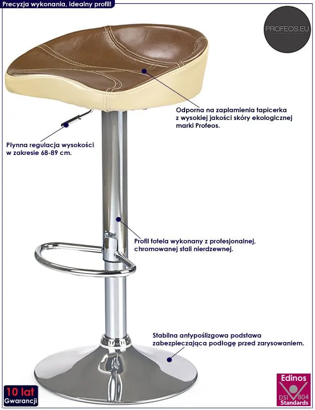 Efektowny i komfortowy hoker Abizo wyróżnia się nie tylko swoją unikalną formą, ale także zastosowaniem materiałów najlepszej jakości. Designerska beżowo-brązowa tapicerka mebla wykonana została z najwyższej jakości ekoskóry (skóry ekologicznej), łatwej do utrzymania w czystości. Ekoskóra używana przy produkcji mebli marki Profeos jest o wiele bardziej odporna na słońce oraz substancje płynne , co pozwala Ci na długie i bezpieczne użytkowanie. Już nie musisz się martwić, że rozlana kawa spowoduje konieczność wymiany mebla. Skóra ekologiczna marki Profeos została pokryta warstwą polichlorku winylu. Profil krzesła stworzony jest z najwyższej jakości chromowanej stali o zawartości aż stali nierdzewnej oraz chromu, co gwarantuje mu niezwykły efekt wizualny, posiadając przy tym ponadprzeciętne cechy antykorozyjne oraz lepszą odporność na uszkodzenia mechaniczne . Płynną regulację wysokości w zakresie 68-89 cm zapewnia Ci pneumatyczny podnośnik, a komfortowe podparcie na stopy dodatkowo zwiększa komfort użytkowania mebla. Klasyczna i wiecznie modna kolorystyka sprawia, że nowe krzesło Abizo świetnie sprawdza się w pomieszczeniach mieszkalnych i komercyjnych urządzonych zarówno w stylu minimalistycznym, jak też nowoczesnym. Pozwól mu odmienić także Twoje wnętrze!