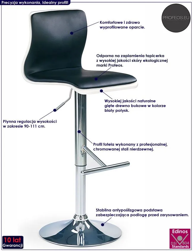 Efektowny i komfortowy hoker Aseris wyróżnia się nie tylko swoją unikalną formą, ale także zastosowaniem materiałów najlepszej jakości. Designerska tapicerka mebla w kolorze czarnym wykonana została z najwyższej jakości ekoskóry (skóry ekologicznej), łatwej do utrzymania w czystości. Ekoskóra używana przy produkcji mebli marki Profeos jest o wiele bardziej odporna na słońce oraz substancje płynne , co pozwala Ci na długie i bezpieczne użytkowanie. Już nie musisz się martwić, że rozlana kawa spowoduje konieczność wymiany mebla. Skóra ekologiczna marki Profeos została pokryta warstwą polichlorku winylu. Profil krzesła stworzony jest z najwyższej jakości chromowanej stali o zawartości aż stali nierdzewnej oraz chromu, co gwarantuje mu niezwykły efekt wizualny, posiadając przy tym ponadprzeciętne cechy antykorozyjne oraz lepszą odporność na uszkodzenia mechaniczne . Siedzisko mebla w kolorze biały połysk stworzone zostało z naturalnego lakierowanego giętego drewna wolnego od alergenów, a następnie zabezpieczonego hipoalergiczną emulsją wodną. Płynną regulację wysokości w zakresie 90-111 cm zapewnia Ci pneumatyczny podnośnik, a komfortowe podparcie na stopy dodatkowo zwiększa komfort użytkowania mebla. Stonowana kolorystyka sprawia, że nowy hoker Aseris świetnie sprawdza się w pomieszczeniach mieszkalnych i komercyjnych urządzonych w stylu minimalistycznym, jak też nowoczesnym i skandynawskim. Pozwól mu odmienić także Twoje wnętrze!
