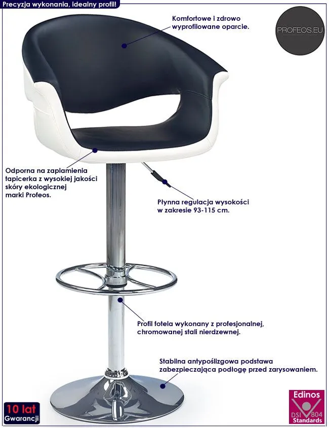 Efektowny i komfortowy hoker Tirani wyróżnia się nie tylko swoją unikalną formą, ale także zastosowaniem materiałów najlepszej jakości. Designerska czarno-biała tapicerka mebla wykonana została z najwyższej jakości ekoskóry (skóry ekologicznej), łatwej do utrzymania w czystości. Ekoskóra używana przy produkcji mebli marki Profeos jest o wiele bardziej odporna na słońce oraz substancje płynne , co pozwala Ci na długie i bezpieczne użytkowanie. Już nie musisz się martwić, że rozlana kawa spowoduje konieczność wymiany mebla. Skóra ekologiczna marki Profeos została pokryta warstwą polichlorku winylu. Profil krzesła stworzony jest z najwyższej jakości chromowanej stali o zawartości aż stali nierdzewnej oraz chromu, co gwarantuje mu niezwykły efekt wizualny, posiadając przy tym ponadprzeciętne cechy antykorozyjne oraz lepszą odporność na uszkodzenia mechaniczne . Płynną regulację wysokości w zakresie 93-115 cm zapewnia Ci pneumatyczny podnośnik, a komfortowe podparcie na stopy dodatkowo zwiększa komfort użytkowania mebla. Klasyczna i wiecznie modna kolorystyka sprawia, że nowe krzesło Tirani świetnie sprawdza się w pomieszczeniach mieszkalnych i komercyjnych urządzonych zarówno w stylu minimalistycznym, jak też nowoczesnym. Pozwól mu odmienić także Twoje wnętrze!