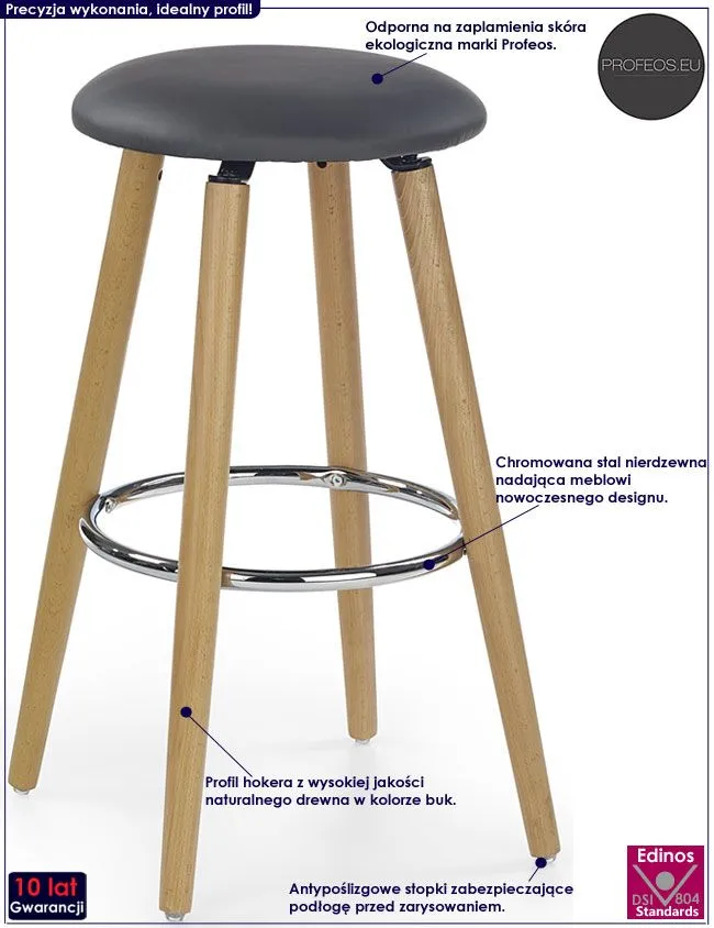 Komfortowy taboret Alaia wyróżnia się nie tylko swoją unikalną formą, ale także zastosowaniem materiałów najlepszej jakości. Designerska tapicerka mebla wykonana została z najwyższej jakości ekoskóry (skóry ekologicznej), łatwej do utrzymania w czystości. Ekoskóra używana przy produkcji mebli marki Profeos jest o wiele bardziej odporna na słońce oraz substancje płynne , co pozwala Ci na długie i bezpieczne użytkowanie. Już nie musisz się martwić, że rozlana kawa spowoduje konieczność wymiany mebla. Skóra ekologiczna marki Profeos została pokryta warstwą polichlorku winylu. Profil hokera w kolorze buk stworzony jest z naturalnego drewna wolnego od alergenów, a następnie zabezpieczonego hipoalergiczną emulsją wodną. Komfortową podpórkę na stopy wyprodukowano z najwyższej jakości chromowanej stali o zawartości aż stali nierdzewnej oraz chromu, co gwarantuje mu niezwykły efekt wizualny, posiadając przy tym ponadprzeciętne cechy antykorozyjne oraz lepszą odporność na uszkodzenia mechaniczne . Stonowana kolorystyka sprawia że hoker świetnie odnajduje się we wnętrzach urządzonych zarówno w stylu nowoczesnym, jak też minimalistycznym czy skandynawskim. Okrągły stołek Alaia doskonale sprawdza się zarówno w pomieszczeniach mieszkalnych, jak i komercyjnych. Pozwól mu odmienić także Twoje wnętrze!