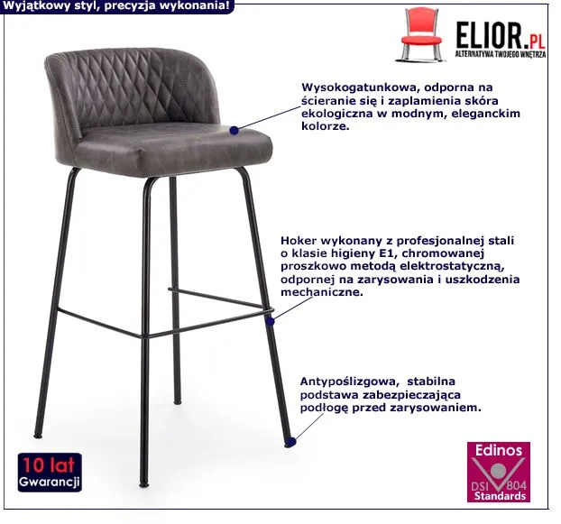 Mystic to właściwie ultrawygodne, tapicerowane krzesło, tyle, że o podwyższonej podstawie. Mamy tu jakże miękką i komfortową w użytkowaniu, stylowo pikowaną skórę ekologiczną oraz designerską, stabilną stal. Tak powstał elegancki po nowoczesnemu, ponadczasowo modny i wyjątkowo wygodny hoker Mystic. Obok tego mebla nie da przejść się obojętnie! Już na pierwszy rzut oka widać, że hoker odznacza się niezrównanym komfortem. W takim meblu to można się rozsiąść! Ponadto zdolny projektant Mystic postarał się o to, by był to mebel równie szykowny i wyrafinowany, jak i modernistyczny oraz designerski. Chyba mu się to udało, prawda?