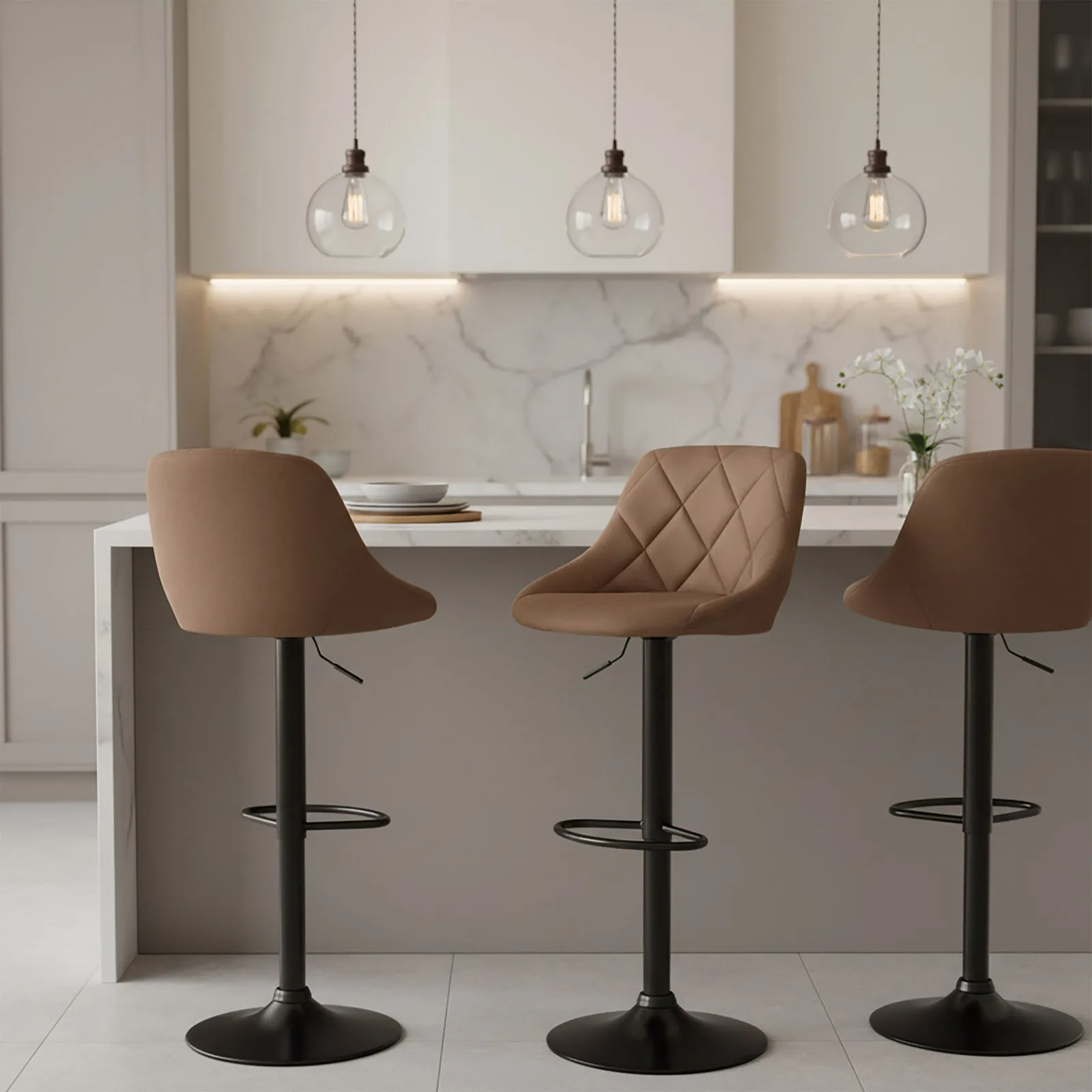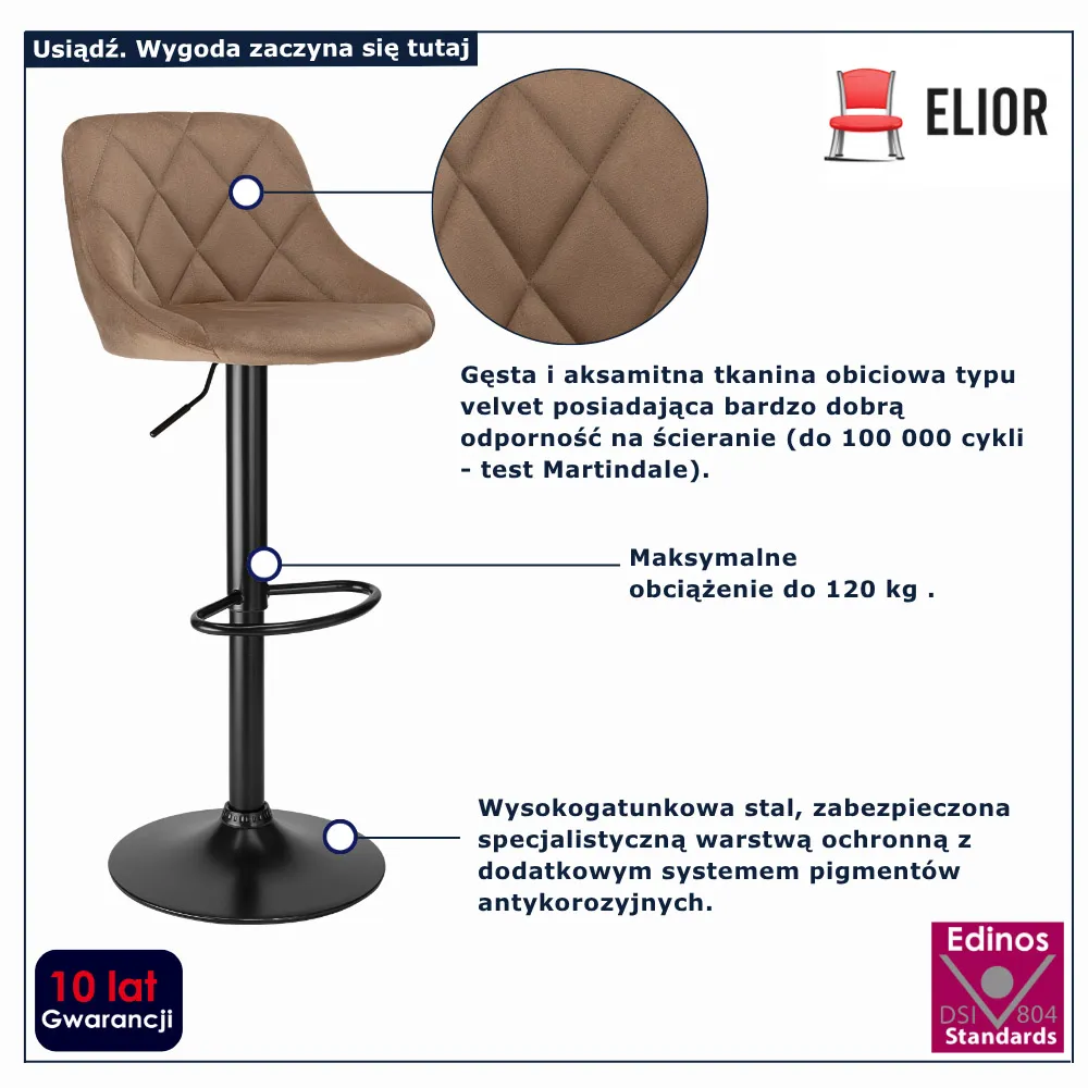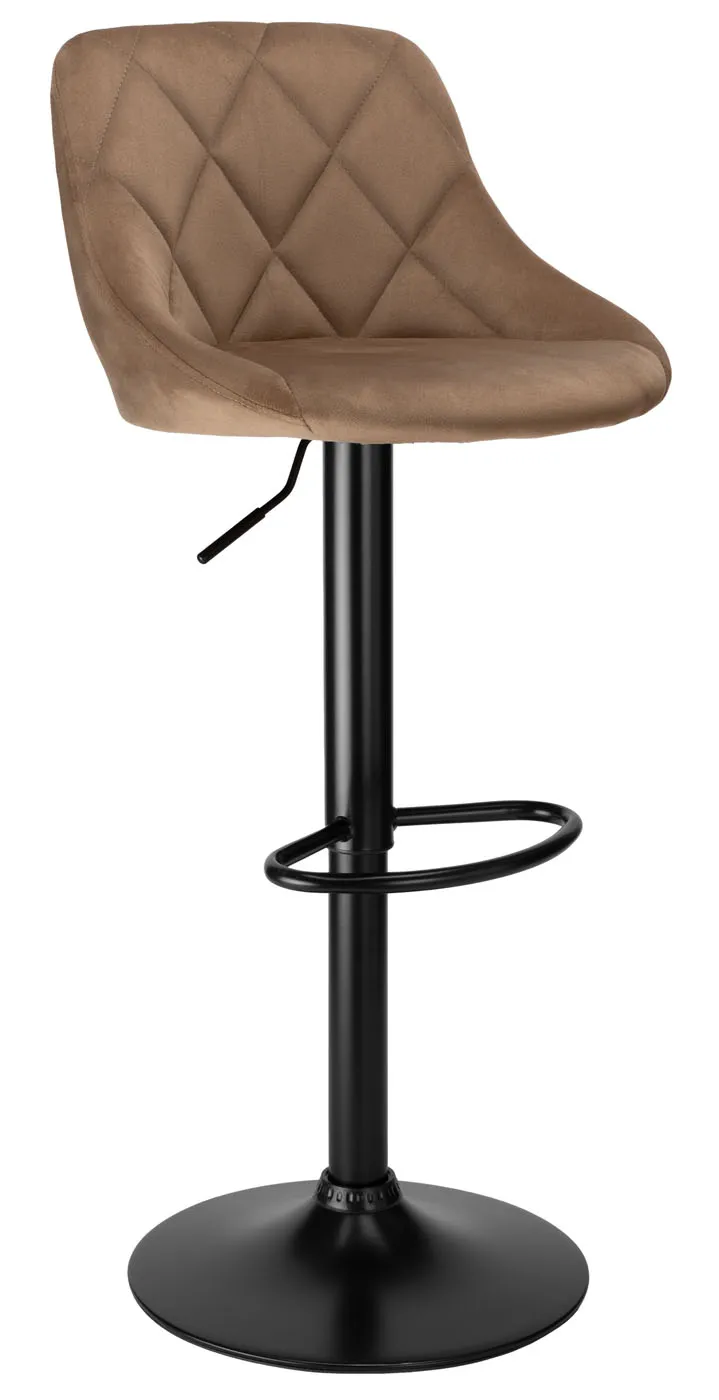 Welurowa tapicerka w kolorze mokka i czarna noga tworzą stylowy akcent w kuchni lub przy barze. Regulacja wysokości i obrotowa konstrukcja zapewniają komfort użytkowania, podusmowując bardzo dobry wybór nawet dla wymagających.