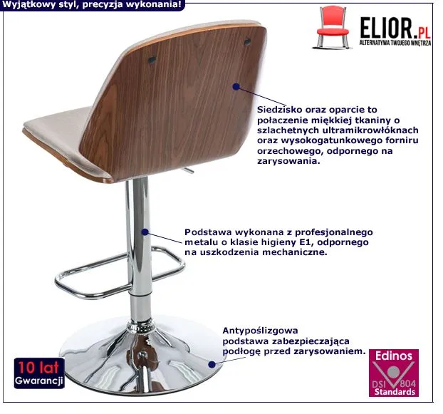 Rewelacyjnie zaprojektowany hoker Ozoni to coś więcej niż nowoczesny styl i staranne wykonanie. Ten wyjątkowy mebel to przede wszystkim niezrównana wygoda użytkowania! Jakże miękka tkanina w przepięknym beżu została połączona z orzechową barwą oraz innowacyjną, srebrną podstawą. Całość prezentuje się nowocześnie, a zarazem nawiązuje do stylu vintage. Ten modny mebel świetnie ozdobi wnętrza: jadalni, kuchni, kawiarni, baru czy resturacji.