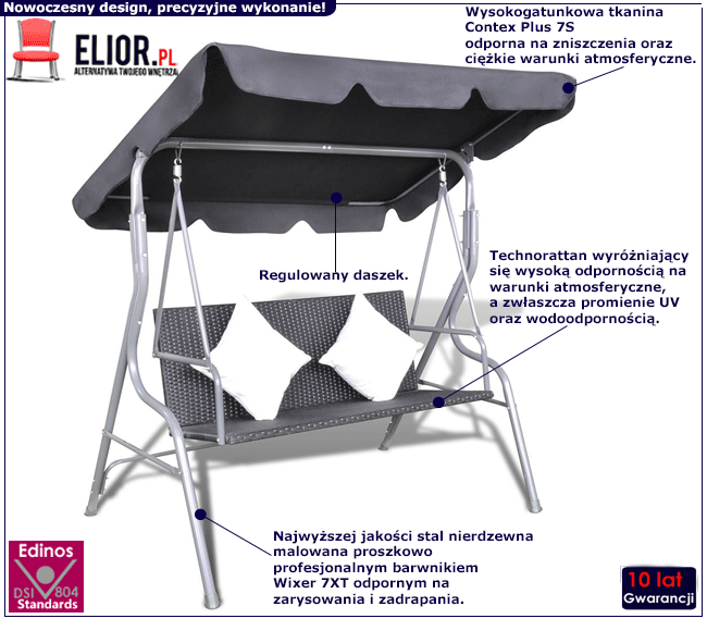 Solidna konstrukcja huśtawki Madres powstała z najwyższej jakości stali nierdzewnej pomalowanej proszkowo odpornym na zarysowania i zadrapania. Najwyższa jakość techniki metody natrysku proszkowego pozwoliła zaoferować firmie Elior aż 10 lat gwar. na swoje produkty. Technika malowania proszkowego charakteryzuje się dużą trwałością, odpornością na korozję, chemikalia, wysoką temperaturę oraz uszkodzenia mechaniczne, dzięki czemu znacznie podnosi walory użytkowe i estetyczne mebla. Siedzisko to ekologiczny technorattan. Technorattan (eko-rattan, eco-rattan, rattan syntetyczny, sztuczny rattan) – wysokiej jakości profesjonalne tworzywo wykonane z podwójnie wzmocnionego włókna polietylenowego HPDE lub poliuretanu o dużej gęstości wzorowane na rattanie naturalnym. Wyróżnia się wysoką odpornością na warunki atmosferyczne, a zwłaszcza promienie UV oraz wodoodpornością. Technorattan nie chłonie wilgoci oraz tłuszczu i nie wymaga pokrywania warstwą ochronną. Jest lekki i łatwy do utrzymania w czystości, co jest szczególnie ważne w przypadku mebli ogrodowych. Technorattan jest ekologiczny i , można go poddawać recyklingowi. Funkcjonalny i trwały daszek powstał z wysokogatunkowej tkaniny Contex Plus 7S o gęstości 600D, powlekanej warstwą vinylu, odpornej na wodę, promienie UV, warunki atmosferyczne, wytrzymałej na nacisk, rozciąganie i rozdarcie. Dzięki tym wspaniałym cechom masz absolutną pewność, że Madres posłuży Ci bez uszkodzeń przez wiele lat. Koniec ze zmartwieniem, że po krótkim czasie huśtawka zmieni się w odstraszające "coś". Od teraz Twój ogród zachwycał będzie doskonałym designem zapewniając Ci jednocześnie prawdziwie wyjątkowy wypoczynek!