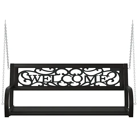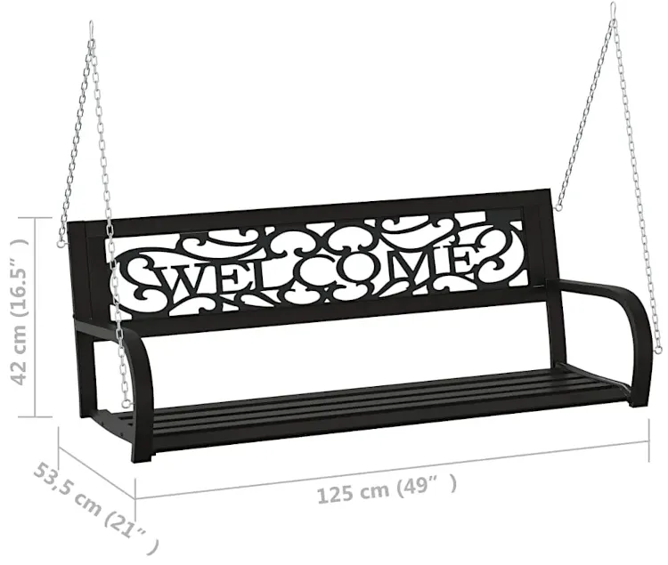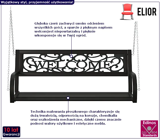 Odkryj magię relaksu w ogrodzie dzięki huśtawce ogrodowej Oferion 5X marki Edinos Premium. Ta elegancka huśtawka, utrzymana w głębokim kolorze czarnym, wyróżnia się nie tylko solidnością wykonania, ale także pięknym napisem welcome na oparciu, dodając subtelności całej kompozycji. Cała konstrukcja huśtawki wykonana jest ze stali, co gwarantuje nie tylko estetyczny wygląd, ale również trwałość przez wiele sezonów.. Odpręż się w swoim ogrodzie. Huśtawka Oferion 5X to więcej niż tylko mebel ogrodowy, to zaproszenie do spędzenia chwil pełnych relaksu w otoczeniu natury.