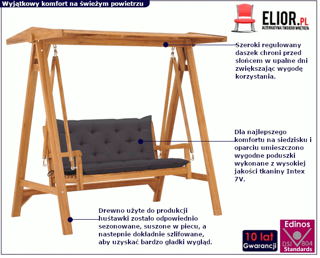 Huśtawka Zavo została wykonana z drobno szlifowanego, twardego drewna tekowego z wykończeniem na bazie wody. Drewno tekowe charakteryzuje się wysoką naturalną zawartością substancji oleistych i kwasu krzemowego, dzięki czemu nie nasiąka wodą i jest odporne na działanie czynników chemicznych oraz biologicznych. Drewno tekowe jest średnio twarde, do ok. 46 MPa w pomiarach metodą Janki. Podczas suszenia prawie nie zmienia objętości i nie kurczy się, co powoduje, że chętnie jest stosowane w przemyśle meblarskim. Świeże drewno ma jasnożółtą barwę i intensywny, przyjemny zapach, później brązowieje. Marka Edinos Premium zadbała o najwyższą jakość huśtawki Zavo. Drewno użyte do produkcji zostało odpowiednio sezonowane, suszone w piecu, a następnie dokładnie szlifowane, aby uzyskać bardzo gładki wygląd. Drewno tekowe znane jest ze swojej wyjątkowej wytrzymałości i odporności na warunki atmosferyczne, dzięki czemu jest o wiele bardziej odpowiednie na meble ogrodowe niż jakikolwiek inny rodzaj drewna. Dla najlepszego komfortu na siedzisku i oparciu umieszczono wygodne poduszki wykonane z wysokiej jakości tkaniny Intex 7V. To tkanina o dekoracyjnym siatkowym splocie, stworzona z mocnych włókien polimerowych o wiązaniach estrowych. Wyróżnia się wysoką odpornością na warunki atmosferyczne, a zwłaszcza promienie UV. Jest łatwa w czyszczeniu, a warstwa vinylu ogranicza przyleganie kurzu, brudu czy pleśni, nawet w najbardziej skrajnych warunkach pogodowych.