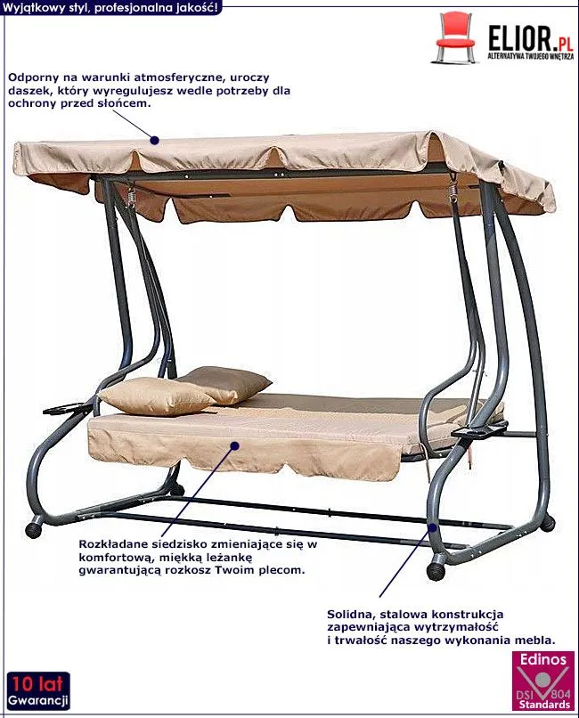 - Kolor: beżowy (w ofercie mamy też huśtawkę Norveso w kolorze szarym). Kliknij w link i sprawdź także inne huśtawki ogrodowe w sklepie Edinos.pl.