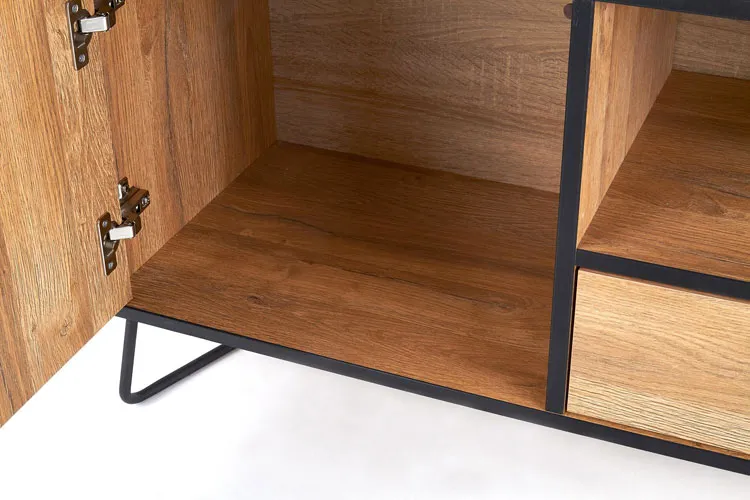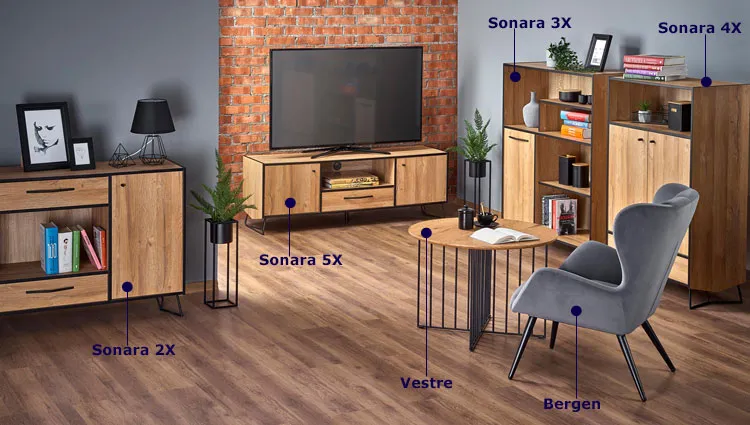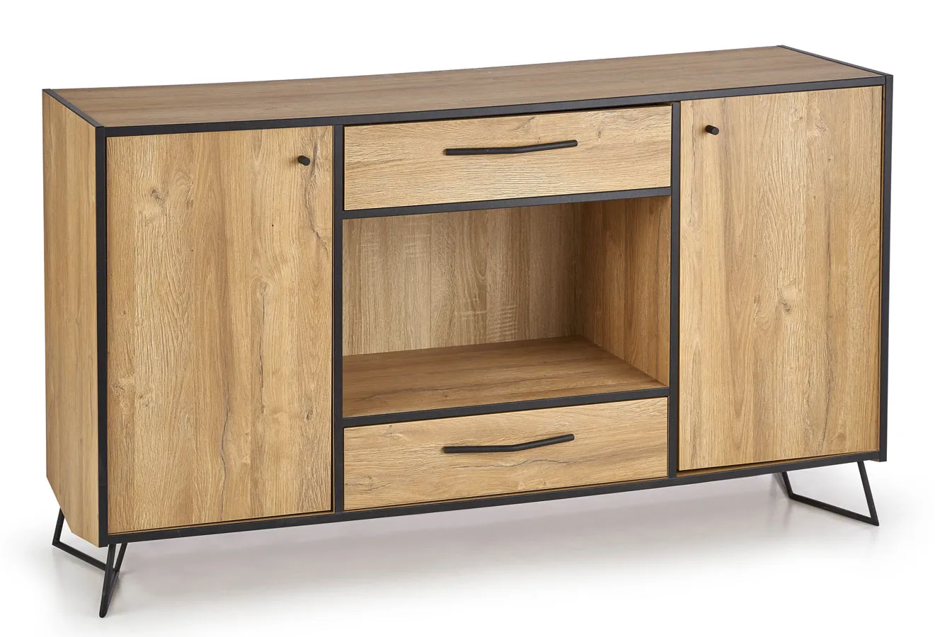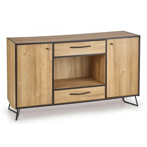 Kolekcja mebli Sonara to projekt wykonany z myślą o osobach gustujących w aranżacjach "z pazurem". Połączenie surowości drewna oraz czarnych dodatków w postaci brzegów, uchwytów oraz intrygującej podstawy tworzy spójną całość nasyconą wyjątkowym charakterem. Wyróżnia się elegancją oraz luksusowym szykiem oraz doskonale wpisuje się w dzisiejsze trendy wnętrzarskie. Ponieważ meble są we wnętrzu bazą tworzącą całą przestrzeń warto postawić na ich mocniejszy styl. Industrialna komoda Abelia 2X to mebel, który nie tylko pozwoli Ci uporządkować w wyjątkowy sposób przestrzeń, ale także stworzy niepowtarzalną atmosferę. Abelia 2X posiada dwie ukryte za frontami półki po lewej i prawej stronie mebla, dwie pojemne szuflady w środkowej części oraz jedną odkrytą półkę również w środkowej części mebla. Całość wieńczy gładki blat stanowiący dodatkowe miejsce użytkowe. Komoda Abelia 2X to doskonałe rozwiązanie zarówno do salonu jak i sypialni, pokoju młodzieżowego, a nawet biura. Nie tylko doskonale wyeksponuje ona eleganckie dodatki w postaci świec zapachowych, ramek ze zdjęciami czy innych bibelotów, ale także może stać się doskonałym miejscem pod telewizor.  Świetnym rozwiązaniem jest też modne dziś uzupełnianie jadalni komodą w której kryje się starannie ułożona zastawa stołowa. Pamiętaj, że wszystko zależy od Twojej wyobraźni - to Ty kreujesz swą niepowtarzalną przestrzeń ogniska domowego.