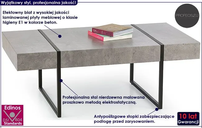 Komfortowa i efektowna ława Seram wyróżnia się nie tylko swoją niebanalną formą i praktycznym kształtem, ale także zastosowaniem materiałów najlepszej jakości. To dlatego cieszy się ona powodzeniem wśród osób wybierających nowatorskie rozwiązania. Oryginalna w formie konstrukcja ławy w kolorze czarnym wykonana została z najwyższej jakości nierdzewnej stali malowanej proszkowo odpornym na zarysowania i zadrapania. Najwyższa jakość techniki polimeryzacji pozwoliła zaoferować firmie Profeos aż 10 lat gwarancji na swoje produkty. Już nie musisz się martwić, że po kilku latach część farby odpryśnie od mebla . Designerski, prostokątny blat ławy w kolorze beton wykonany został z laminowanej płyty meblowej o klasie higieny E1, uszlachetnionej cienkimi filmami melaminowymi. Posiada także specjalne włókna ułożone różnokierunkowo o strukturze sinusoidalnej, co zapewnia nadanie jej cech jakościowych oraz wytrzymałościowych. Stonowana kolorystyka i prosta forma sprawiają, że stolik kawowy Seram doskonale sprawdza się we wnętrzach urządzonych zarówno w stylu industrialnym, jak też minimalistycznym czy nowoczesnym. Ława Profeos dodaje wnętrzu harmonii i modnego "przemysłowego" designu, a każdy łyk kawy przy niej wypity pozwala Ci odetchnąć od codziennego zgiełku i pośpiechu. Nadaj Twojemu wnętrzu wyrazistego designu w ekspresyjnym, industrialnym stylu ze stolikiem kawowym Seram!