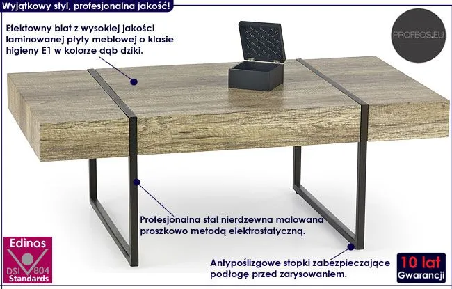 Komfortowa i efektowna ława Seram wyróżnia się nie tylko swoją niebanalną formą i praktycznym kształtem, ale także zastosowaniem materiałów najlepszej jakości. To dlatego cieszy się ona powodzeniem wśród osób wybierających nowatorskie rozwiązania. Oryginalna w formie konstrukcja ławy w kolorze czarnym wykonana została z najwyższej jakości nierdzewnej stali malowanej proszkowo odpornym na zarysowania i zadrapania. Najwyższa jakość techniki polimeryzacji pozwoliła zaoferować firmie Profeos aż 10 lat gwarancji na swoje produkty. Już nie musisz się martwić, że po kilku latach część farby odpryśnie od mebla . Designerski, prostokątny blat ławy w kolorze dziki dąb wykonany został z laminowanej płyty meblowej o klasie higieny E1, uszlachetnionej cienkimi filmami melaminowymi. Posiada także specjalne włókna ułożone różnokierunkowo o strukturze sinusoidalnej, co zapewnia nadanie jej cech jakościowych oraz wytrzymałościowych. Stonowana kolorystyka i prosta forma sprawiają, że stolik kawowy Seram doskonale sprawdza się we wnętrzach urządzonych zarówno w stylu industrialnym, jak też minimalistycznym czy nowoczesnym. Ława Profeos dodaje wnętrzu harmonii i modnego "przemysłowego" designu, a każdy łyk kawy przy niej wypity pozwala Ci odetchnąć od codziennego zgiełku i pośpiechu. Nadaj Twojemu wnętrzu wyrazistego designu w ekspresyjnym, industrialnym stylu ze stolikiem kawowym Seram!