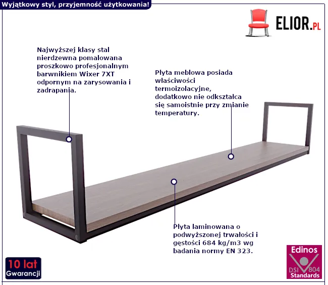 Niezwykła forma oraz eleganckie wykonanie to nie jedyne zalety półki Sabul 12X marki Edinos Premium. Oprócz tego mebel wyróżnia się najwyższą jakością materiałów użytych do jej produkcji oraz wieloetapowym procesem selekcji tak, aby wybrać tylko materiały o najlepszych właściwościach. Półka powstała z laminowanej płyty meblowej o podwyższonej trwałości i gęstości do 684 kg/m3 wg badania normy EN 323. Włókna drzewne w półce Sabul 12X ułożone są różnokierunkowo, o strukturze sinusoidalnej, co zapewnia nadanie jej cech jakościowych oraz wytrzymałościowych. Dodatkowo płyta została uszlachetniona cienkimi filmami melaminowymi w celu zwiększenia jej trwałości. Wzmocnienie wykonane ze stali nierdzewnej sprawia, że półka nie ugina się pod ciężarem i może unieść naprawdę wiele przedmiotów. Stal ta została pomalowana proszkowo profesjonalnym barwnikiem odpornym na zarysowania i zadrapania. Technika malowania proszkowego charakteryzuje się dużą trwałością, odpornością na korozję, chemikalia, wysoką temperaturę oraz uszkodzenia mechaniczne oraz w całości i równomiernie pokrywa całą powierzchnię farbą.