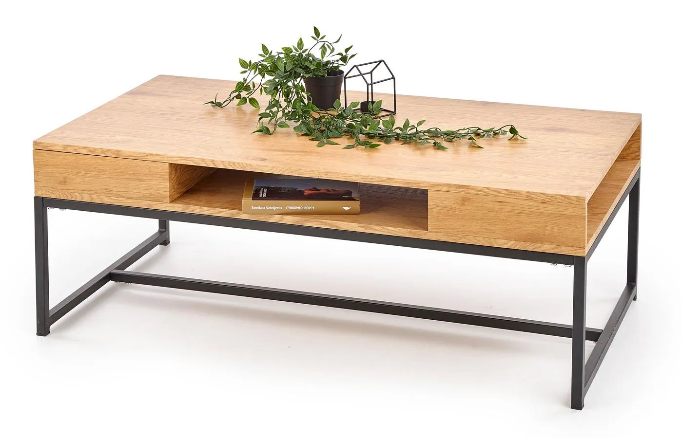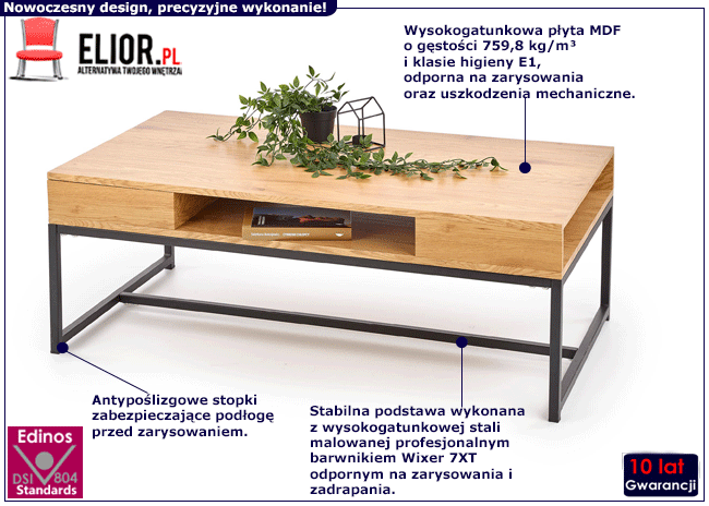 Jesteś zwolennikiem funkcjonalnych mebli? Cenisz sobie doskonałą jakość oraz nietuzinkowy design? Befo to mebel stworzony właśnie dla Ciebie! Zaskakująco efektowne połączenie drewnianego dekoru oraz czarnej, lekkiej podstawy zamknięte w niezwykle modernistycznej formie. Blat ławy to pozornie prosty, choć niesamowicie funkcjonalny prostokąt w ciepłym odcieniu dębu złotego, posiadający trzy przydatne półki, które pozwolą Ci na utrzymanie porządku we wnętrzu. Pilot do telewizora, książka, chusteczki higieniczne - od teraz Twój blat będzie nieskazitelnie czysty, ponieważ to wszystko znajdzie swoje miejsce w starannie ukrytych półkach blatu. Unosi się on na prostej podstawie w kolorze czerni zapewniającej całości niezwykłą stabilność. Befo wprowadzi do Twojego wnętrza ciepło domowego ogniska, podkreślając jednocześnie całą aranżację w zdecydowany sposób. Dzięki nienachalnej formie nie przytłoczy wnętrza, a jej ponadczasowy design sprawi, że przez wiele lat niezmiennie zdobić będzie Twoje wnętrze. Ława Befo to perfekcyjne rozwiązanie do wnętrz w stylu industrialnym, nowoczesnym, a nawet klasycznym. Doskonale odnajdzie się zarówno w salonie jak i biurze lub poczekalni. Stwórz aranżację w wyjątkowo modnym stylu z doskonałą ławą Befo!