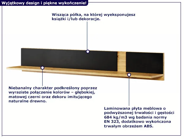 • Modna kolorystyka: czarny + dąb evoke. Kliknij w link i sprawdź także inne wiszące półki w sklepie Edinos.pl. Stwórz swój praktyczny zestaw mebli.