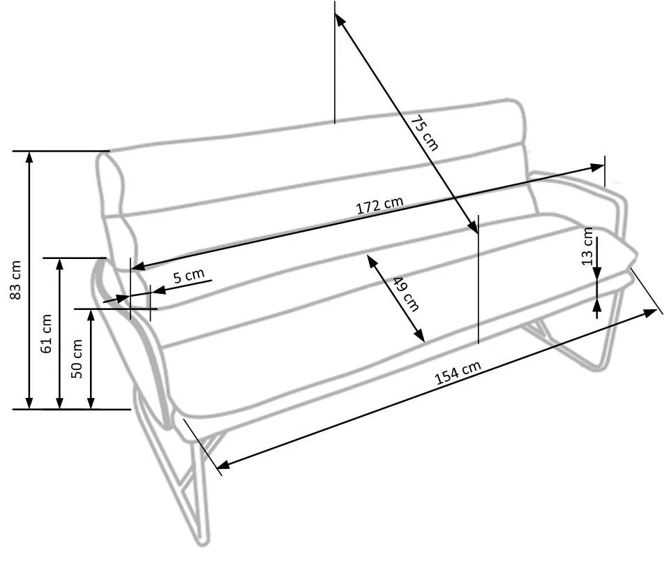 - Wymiary: szerokość mebla: 172 cm, szerokość siedziska: 154 cm, głębokość mebla: 75 cm, głębokość siedziska: 49 cm, wysokość siedziska: 50 cm, wysokość od podłoża do końca podłokietników: 61 cm, wysokość całkowita: 83 cm.
