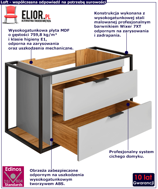 • Produkt posiada certyfikat jakości "Edinos Standards DSI 804", który potwierdza najwyższą jakość wykonania mebla oraz pełny stopień zgodności poszczególnych jednostek wytworzonego wyrobu z przyjętym wzorcem.