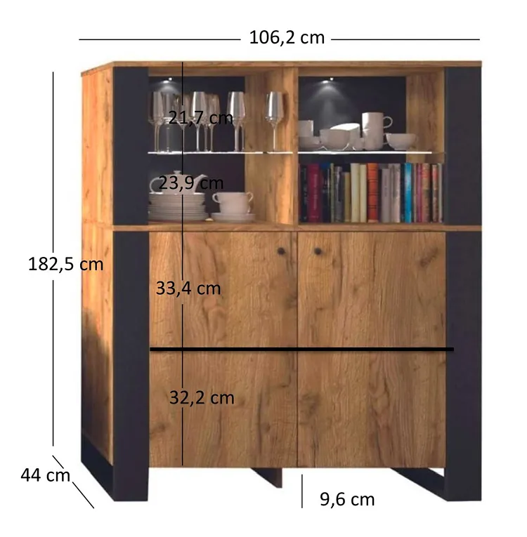 • Wszechstronne przechowywanie: półki za szklanymi drzwiczkami idealnie nadają się do eksponowania ulubionych przedmiotów, podczas gdy ukryte półki za frontem mebla oferują dodatkową przestrzeń na rzeczy, które wolisz trzymać poza wzrokiem.