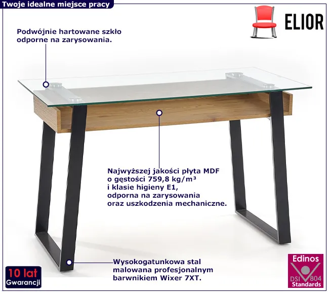 Odkryj nowy wymiar pracy i nauki z biurkiem Mobium marki Elior, które łączy w sobie surową elegancję z funkcjonalnością. Szklany blat nadaje lekkości i nowoczesnego wyglądu, jednocześnie zapewniając wygodną przestrzeń do codziennej aktywności. Pod nim znajduje się praktyczna półka z płyty meblowej - idealne miejsce na przechowywanie notatek, książek czy urządzeń elektronicznych. Stabilna, metalowa podstawa dodaje całości industrialnego charakteru, wprowadzając do wnętrza nutę loftowego stylu.