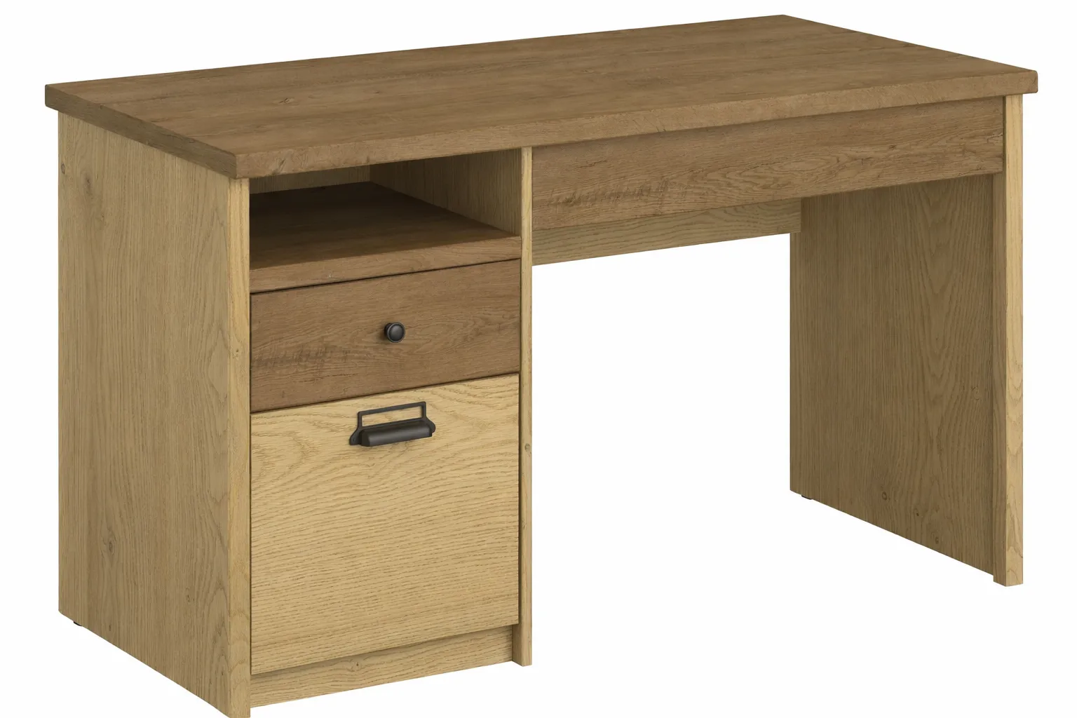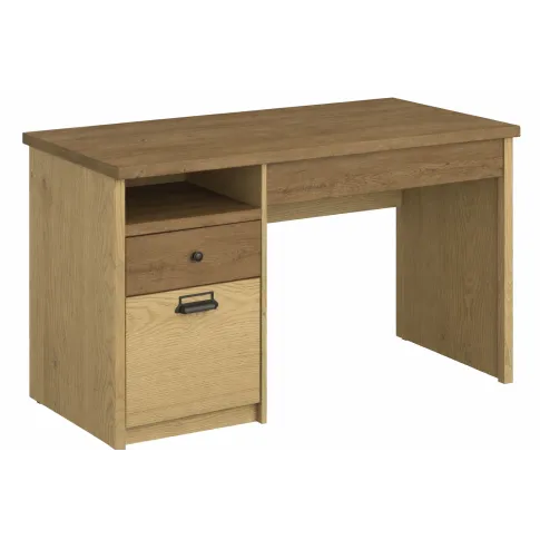 Biurko ma bardzo estetyczny kolor dębu i fajnie łączy się z czarnymi akcentami. Po złożeniu stoi stabilnie, a szafka ma większą pojemność, niż się spodziewałem. Paczka przyszła dobrze zabezpieczona, w środku wszystko równe i bez rys. Świetnie prezentuje się w domowym biurze.
