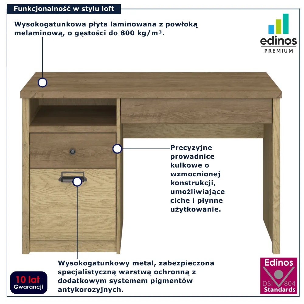 Biurko Sevisso 5X marki Edinos Premium to solidna baza do nauki, pracy i rozwijania pasji w młodzieżowym pokoju lub domowym gabinecie. Jego funkcjonalna konstrukcja łączy szeroki blat z praktycznymi szufladami i otwartą wnęką, dzięki czemu wszystkie najważniejsze rzeczy są zawsze pod ręką. Loftowa estetyka i kontrastowe detale wyróżniają je na tle klasycznych biurek, tworząc mebel o charakterze i energii, który sprawia, że przestrzeń staje się bardziej uporządkowana i inspirująca. To biurko, które realnie ułatwia codzienne obowiązki i wprowadza do wnętrza nowoczesny, designerski rytm.