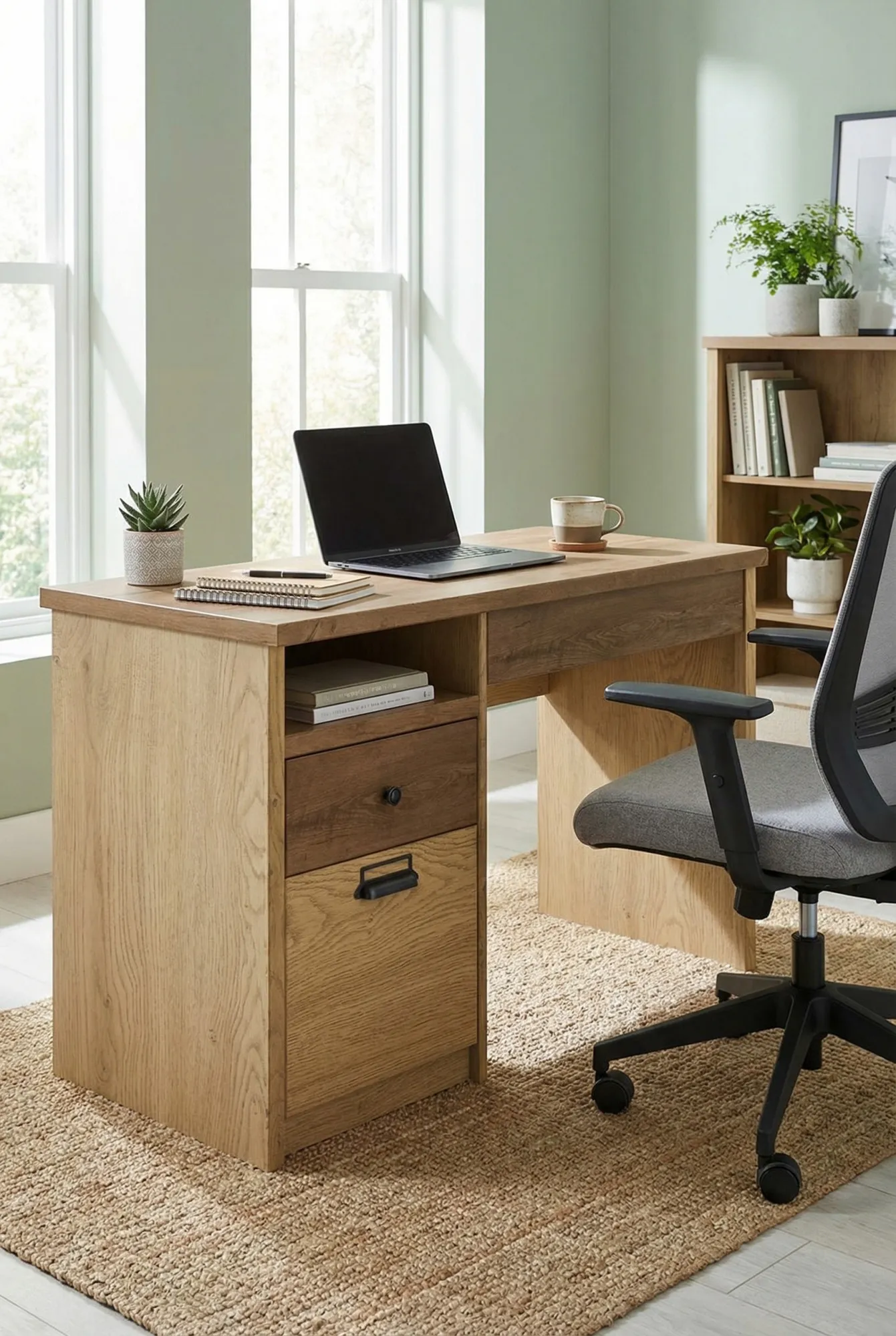Dla mnie to idealne połączenie stylu i praktyczności. Szafka mieści segregatory, a blat jest szeroki, więc swobodnie mieści laptopa i dodatkowe akcesoria. Dostawa sprawna, kurier zadzwonił przed przyjazdem. Całość robi naprawdę bardzo solidne wrażenie.