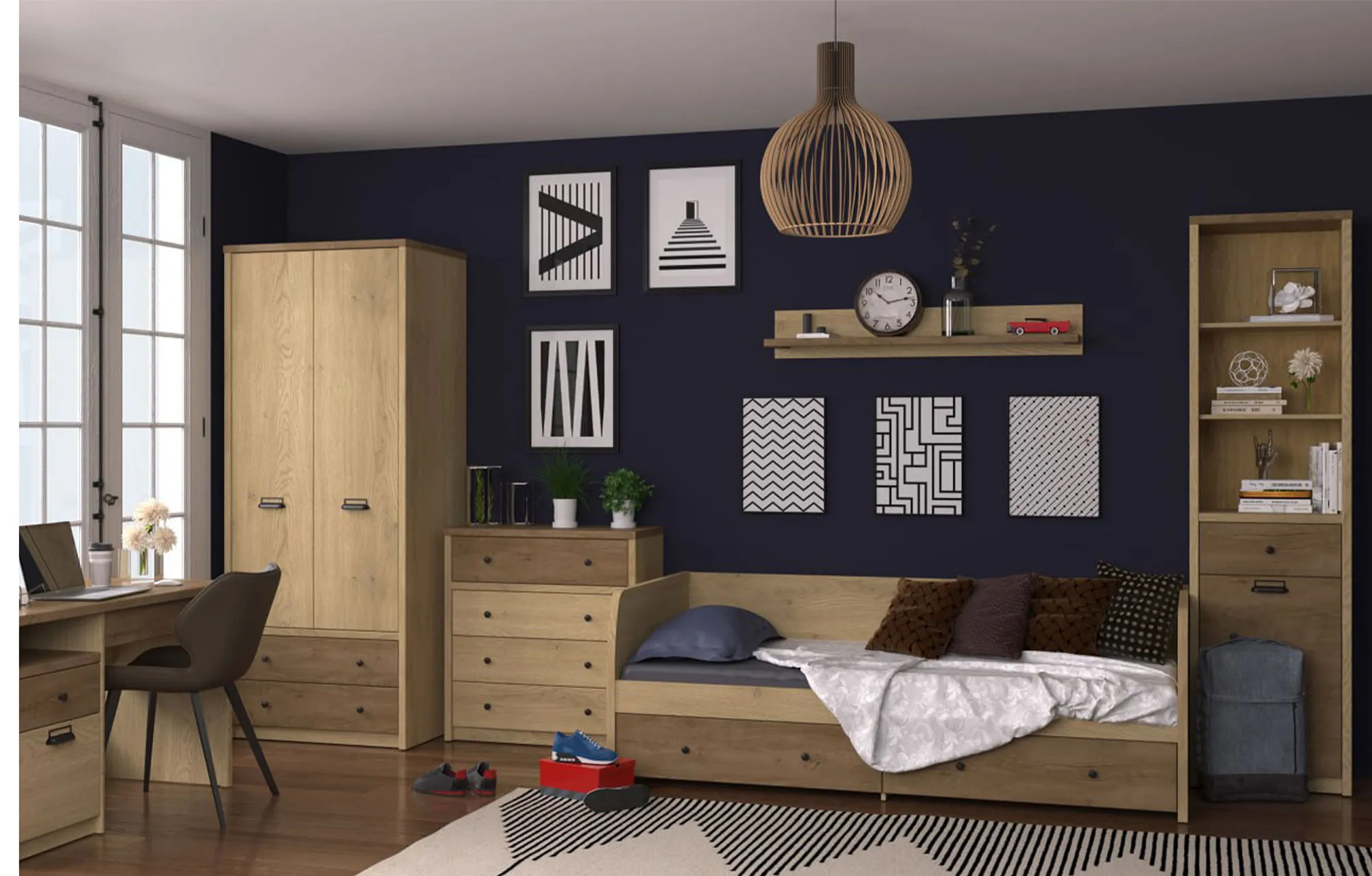 Kolekcja Sevisso powstała z myślą o młodzieżowych wnętrzach, które mają łączyć loftowy klimat z nowoczesną funkcjonalnością. Projektanci subtelnie połączyli dwa kolory w jednej bryle, tworząc zestaw mebli o wyrazistej, a jednocześnie przyjaznej estetyce. Serię wyróżniają masywne, proste formy, dwa rodzaje designerskich uchwytów oraz charakterystyczne łóżko typu sofa z praktycznymi szufladami. Całość tworzy spójny koncept, w którym każdy element ma swoje konkretne zadanie i miejsce.