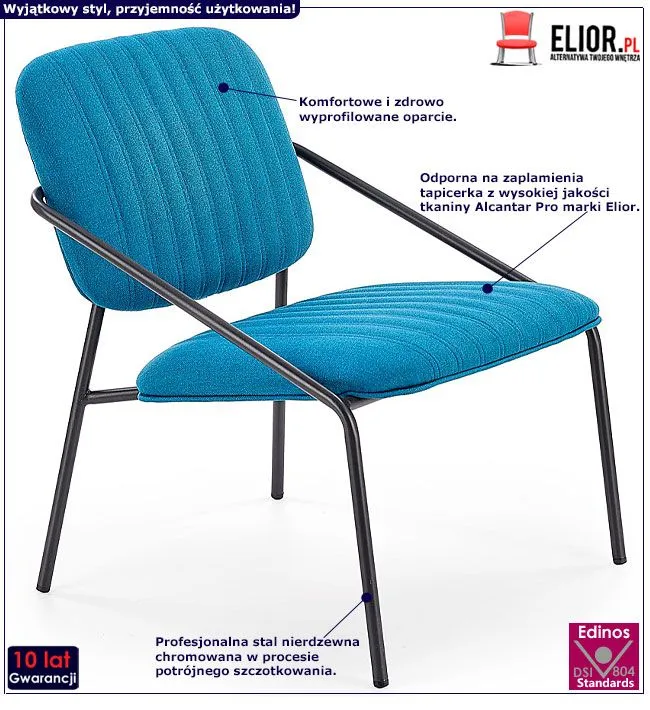 Zjawiskowy i komfortowy w użytkowaniu fotel relaksacyjny Orfo wyróżnia się nie tylko swoim modnym designem, ale także zastosowaniem materiałów najlepszej jakości. Designerska tapicerka mebla w kolorze niebieskim wykonana została z wysokiej jakości tkaniny Alcantar Pro, charakteryzującej się dużą odpornością na ścieranie i zabrudzenie oraz niezwykłą miękkością w dotyku (dzięki warstwie poliuretanu). Tkanina Alcantar Pro, która jako jedyna na rynku produkowana jest z dokładnie wyselekcjonowanych ultramikrowłókien o objętości aż do 24-razy drobniejszej od ludzkiego włosa, charakteryzuje się wyjątkową żywotnością, odpornością oraz niezwykłą łatwością w utrzymaniu. Posiada ponadprzeciętne cechy wytrzymałościowe, dzięki czemu unikniesz co sezonowej wymiany tapicerki. Tkanina Alcantar jest także bardzo praktyczna i można ją czyścić na mokro. Czarną konstrukcję mebla wyprodukowano stworzono z najwyższej jakości nierdzewnej stali malowanej odpornym na zarysowania i zadrapania. Najwyższa jakość techniki polimeryzacji pozwoliła zaoferować firmie Elior aż 10 lat gwarancji na swoje produkty. Już nie musisz się martwić, że po kilku latach część farby odpryśnie od mebla . Zastosowanie tych odpornych na uszkodzenia materiałów znacząco wydłuża czas eksploatacji mebla, co pozwoli Ci na cieszenie się jego wygodą przez długie lata.