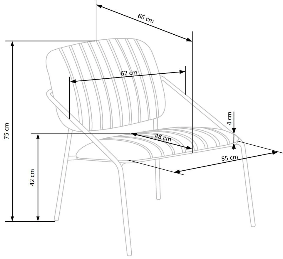 - Wymiary: szerokość mebla: 62 cm, szerokość siedziska: 55 cm, głębokość mebla: 66 cm, głębokość siedziska: 48 cm, wysokość siedziska: 42 cm, wysokość mebla: 75 cm.