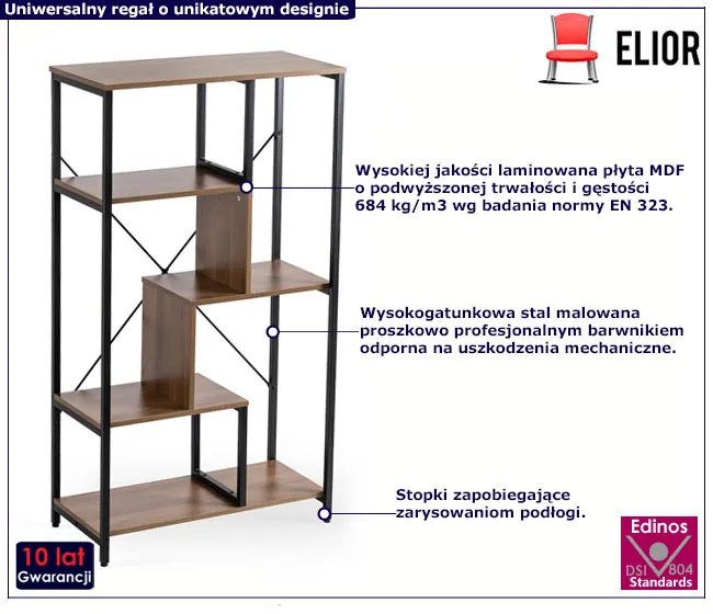 • półki wykonane z trwałej, laminowanej płyty MDF o podwyższonej trwałości i gęstości