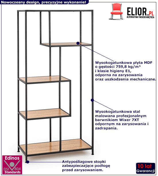 Doskonały regał Vitori poza nietuzinkową prezencją reprezentuje także jakość na najwyższym poziomie. Specjaliści marki Elior zadbali o każdy szczegół tak, aby regał służył Ci godnie bez uszkodzeń przez wiele lat. Precyzyjna praca przy produkcji regału sprawiła, że jest on profesjonalnie wykończony, a wysokogatunkowe materiały wykorzystane do jego produkcji zapewniają niesamowitą stabilność i trwałość. Konstrukcja mebla wykonana została z najwyższej jakości stali nierdzewnej pomalowanej proszkowo odpornym na zarysowania i zadrapania. Najwyższa jakość techniki metody natrysku proszkowego pozwoliła zaoferować firmie Elior aż 10 lat gwar. na swoje produkty. Technika malowania proszkowego charakteryzuje się dużą trwałością, odpornością na korozję, chemikalia, wysoką temperaturę oraz uszkodzenia mechaniczne, dzięki czemu znacznie podnosi walory użytkowe i estetyczne mebla. Półki w kolorze dąb sonoma wykonane zostały z naturalnej płyty meblowej zbudowanej z włókien drzewnych i związków organicznych w warunkach wysokiego ciśnienia i temperatury. Włókna ułożone są różnokierunkowo, o strukturze sinusoidalnej, co zapewnia nadanie jej cech jakościowych oraz wytrzymałościowych. Dodatkowo płyta została uszlachetniona cienkimi filmami melaminowymi w celu zwiększenia jej trwałości. Wspaniały regał Vitori bez wątpienia spełni Twoje wszystkie oczekiwania i sprawi, że w Twoim wnętrzu zapanuje doskonały ład i harmonia!