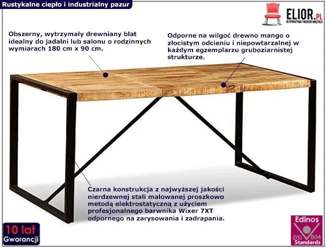 Od strony czysto technicznej blat stołu Elinor ma wymiary 180 cm x 90 cm, a jego wysokość 76 cm jest optymalna dla ergonomii i zwykłej wygody siedzenia przy spożywaniu posiłku, za którą będą wdzięczne Twoje plecy. Czarna konstrukcja mebla stworzona jest z najwyższej jakości nierdzewnej stali malowanej proszkowo metodą elektrostatyczną z użyciem profesjonalnego barwnika odpornego na zarysowania i zadrapania. Wykorzystana technologia malowania zapewnia również znacznie wyższy poziom gładkości, a co za tym idzie estetyki oraz odporność na korozję, chemikalia i uszkodzenia mechaniczne. Wybierając ten produkt pamiętaj o naturze drewna mangowca: odporne na wilgoć i wodę (z pewnością ogromna zaleta przy kontakcie z produktami spożywczymi) charakteryzuje się gruboziarnistą strukturą i oryginalnym, pięknym usłojeniem, które jest unikalne dla każdego kawałka drewna. Każdy stół Elinor będzie jedyny w swoim rodzaju.